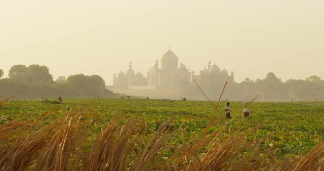Kakri (Indian Cucumber), and Ghiya (Bottle Gourd) farmers work with the Taj Mahal as their backdrop. This farmer is finished with a batch of vegetables, and is walking to the main street to sell them.