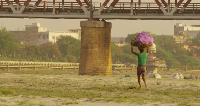 Kakri (Indian Cucumber), and Ghiya (Bottle Gourd) farmers work with the Taj Mahal as their backdrop. This farmer is finished with a batch of vegetables, and is walking to the main street to sell them.