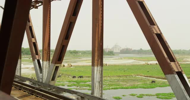 Taj Mahal View from a Railway bridge. The Yamuna River passes with farmers and buffalo herders below.