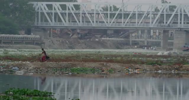 A young boy navigates through the Yamuna River near the Taj Mahal.