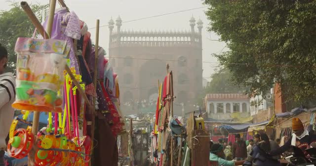 People busy selling and buying things at Meena Bazaar; with people going for afternoon prayers in the background.