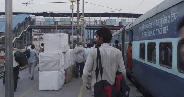People departing their train and New Delhi Railway Station.