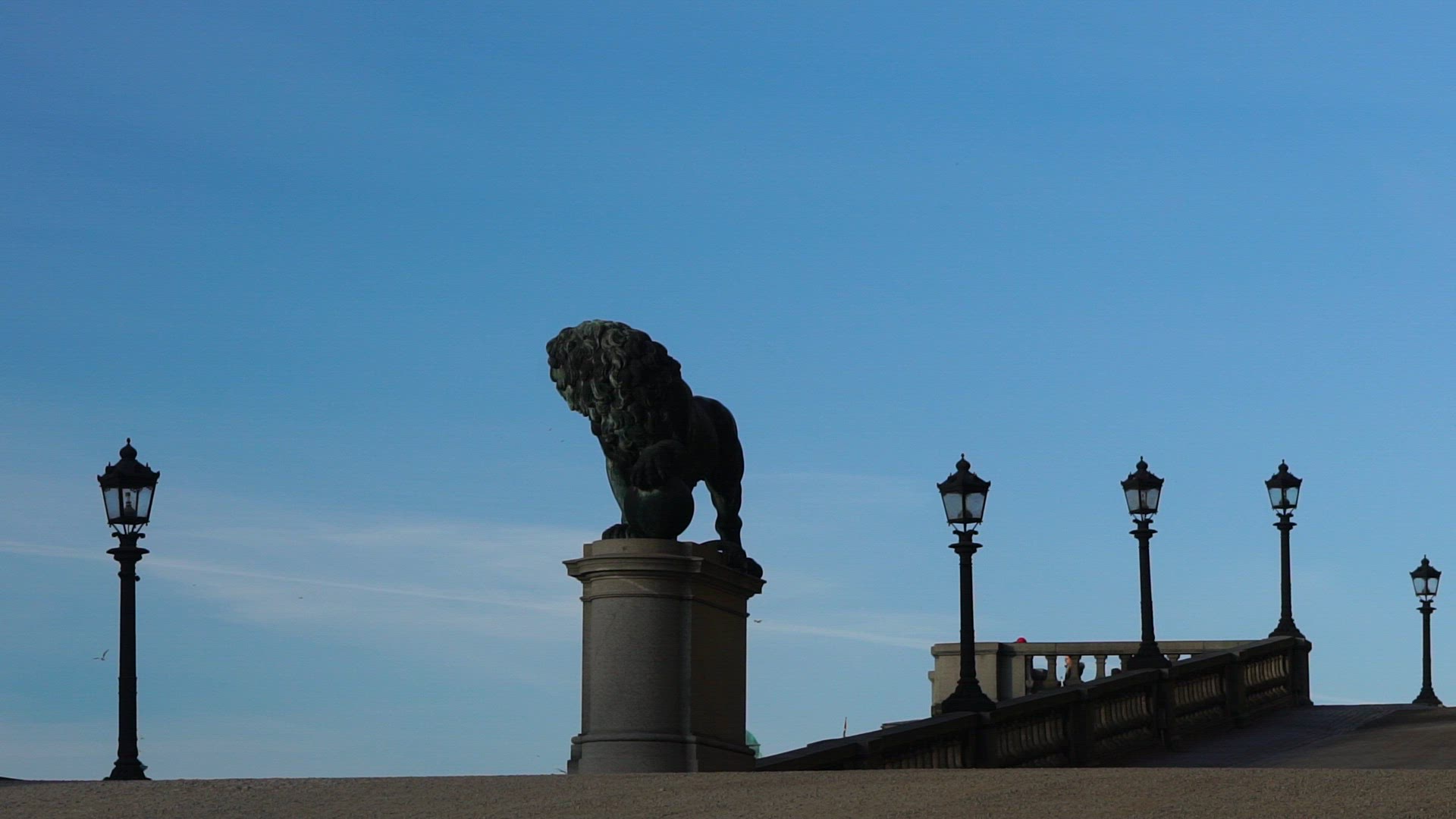2186043 - slow motion shot of lion statue in stockholm - seagull flying close to statue
