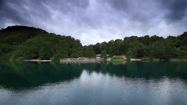 Slow introduction shot arriving to land on a boat. Aggressive cloudy sky. Dense vegetation.