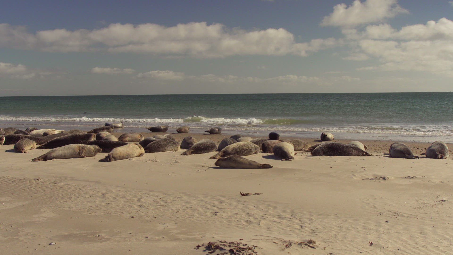 Harbor seals lie on the beach.