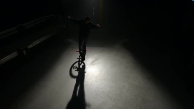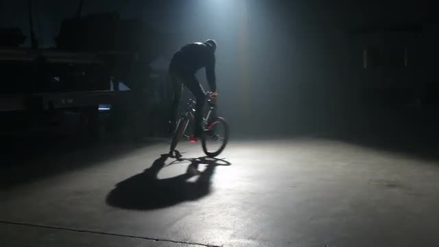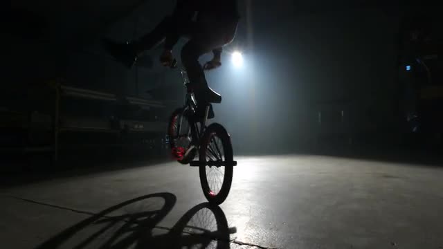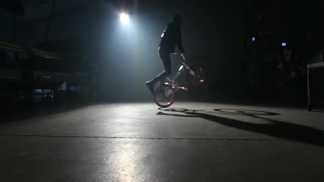 374724 - BMX rider doing tricks in dark warehouse.