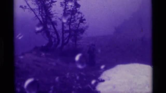 681315 - 1975: droplets of water on lens displays four people camping, standing, walking outdoors with packs
