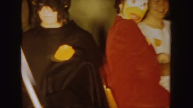 Kids dressed in Halloween costumes. Adults in costume. Woman in Lifesaver costume. Kids trick or treat. Girl in princess costume. Kids pose in costumes.