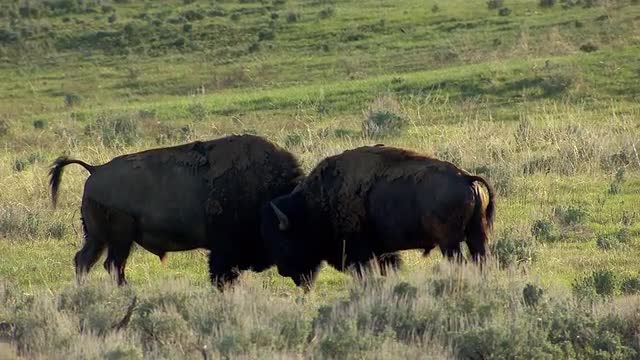 Dolly shot of two bison standing in a field.