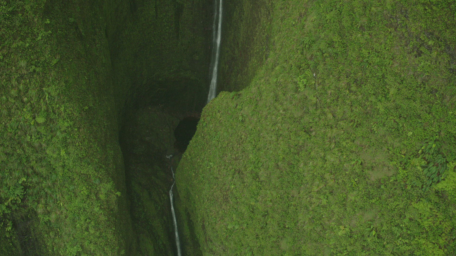 Aerial shot of a waterfall on a grassy cliff in Hawaii.