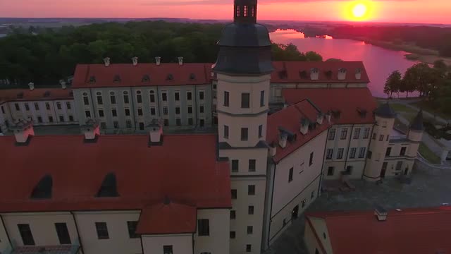 705334 - Aerial View. Flying over the castle's old town at sunset with sun rays. 4K
