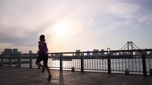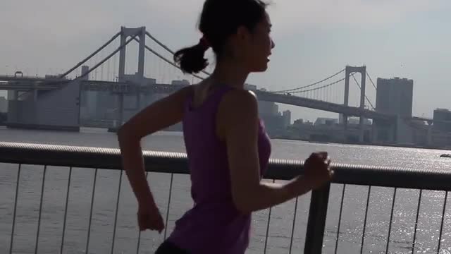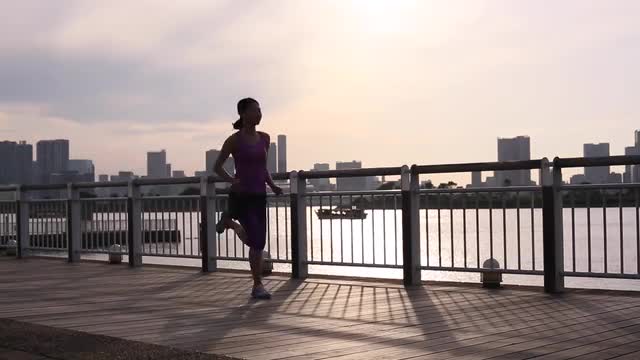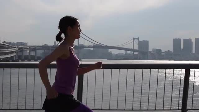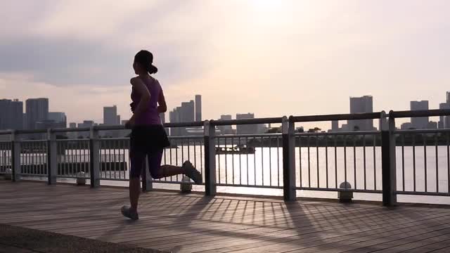Sliding cinematic shot of runner stopping and stretching. Cold outside.