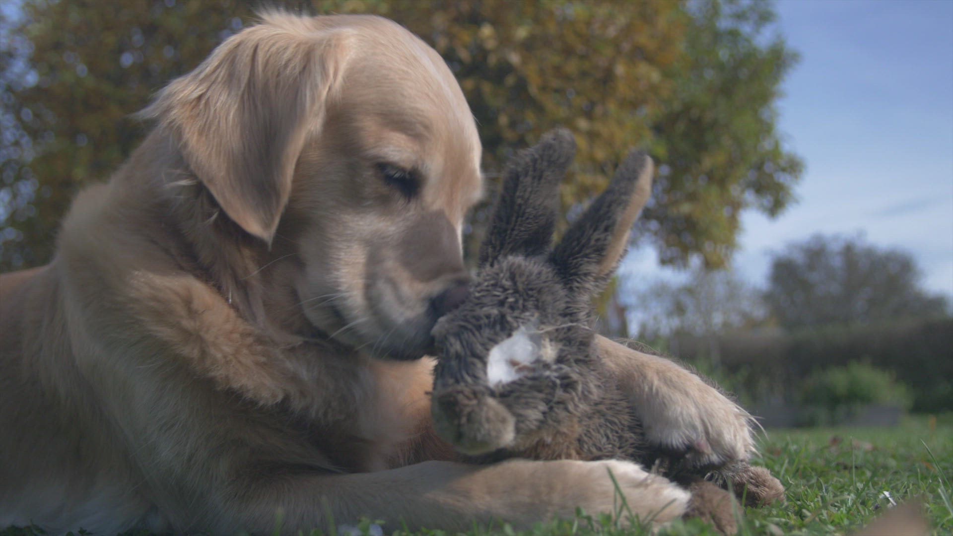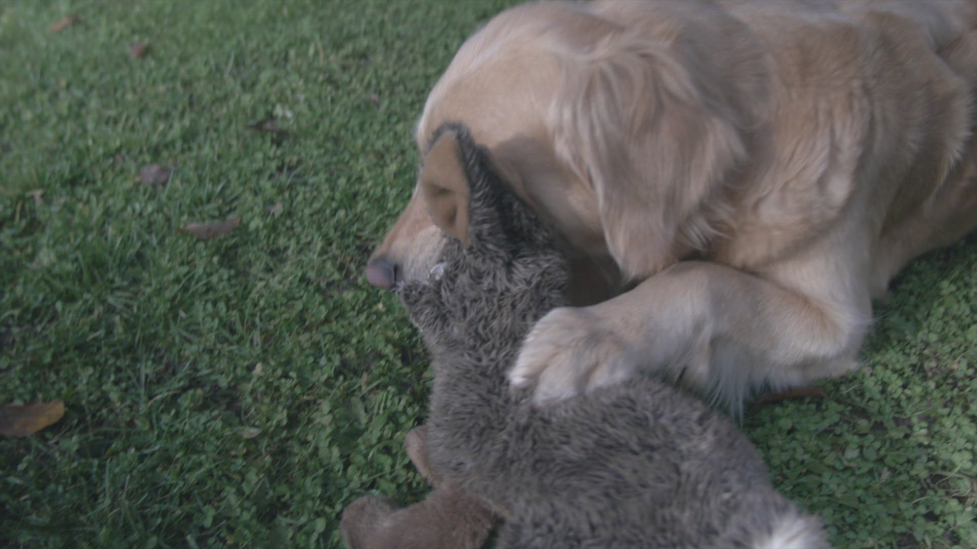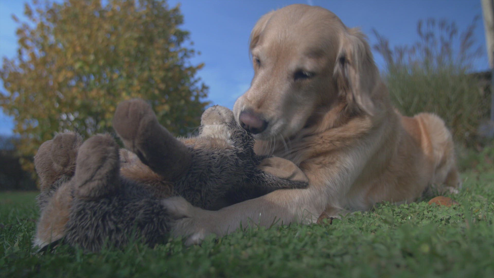 583874 - Golden Retriever Dog Falling Asleep in Forest Mountains