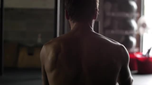 An intense male athlete exercises on a rowing machine in cinematic lighting.