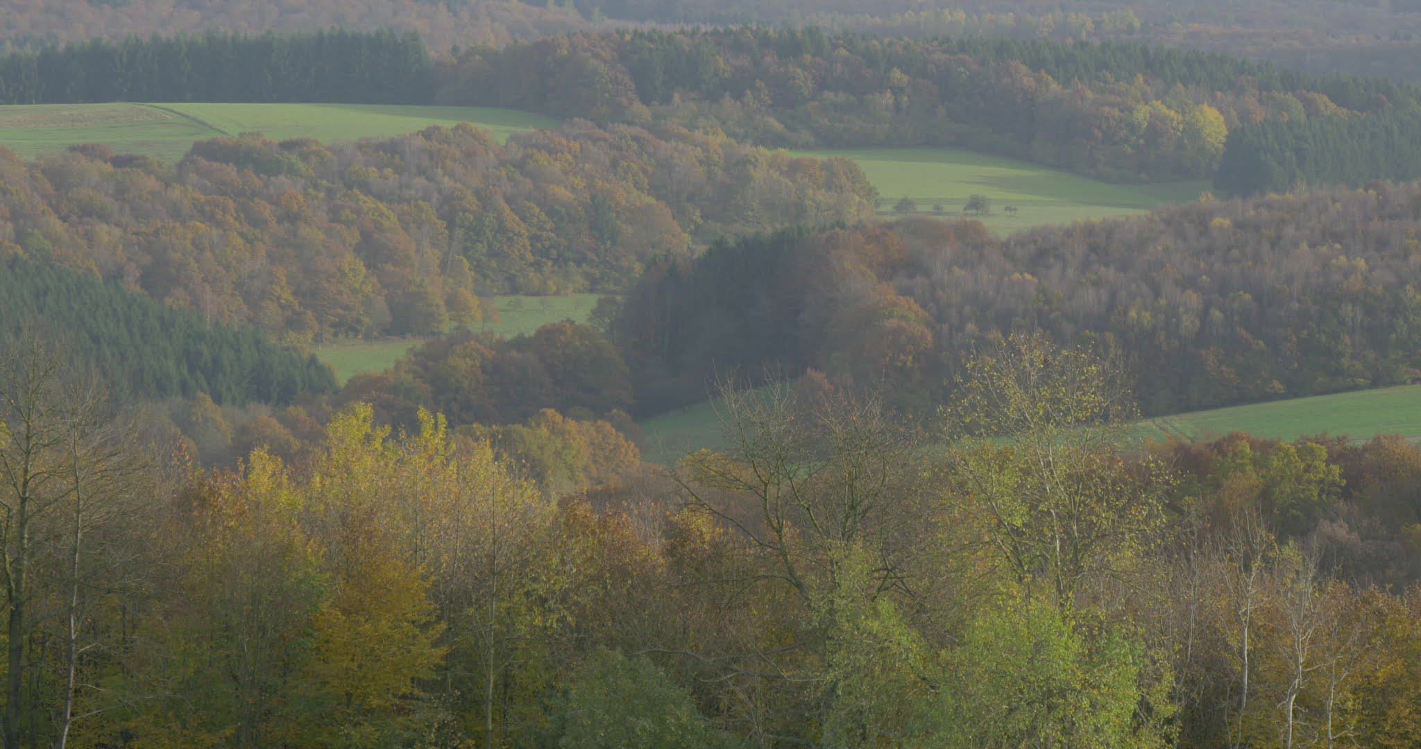 tops of fall forest trees and green meadows