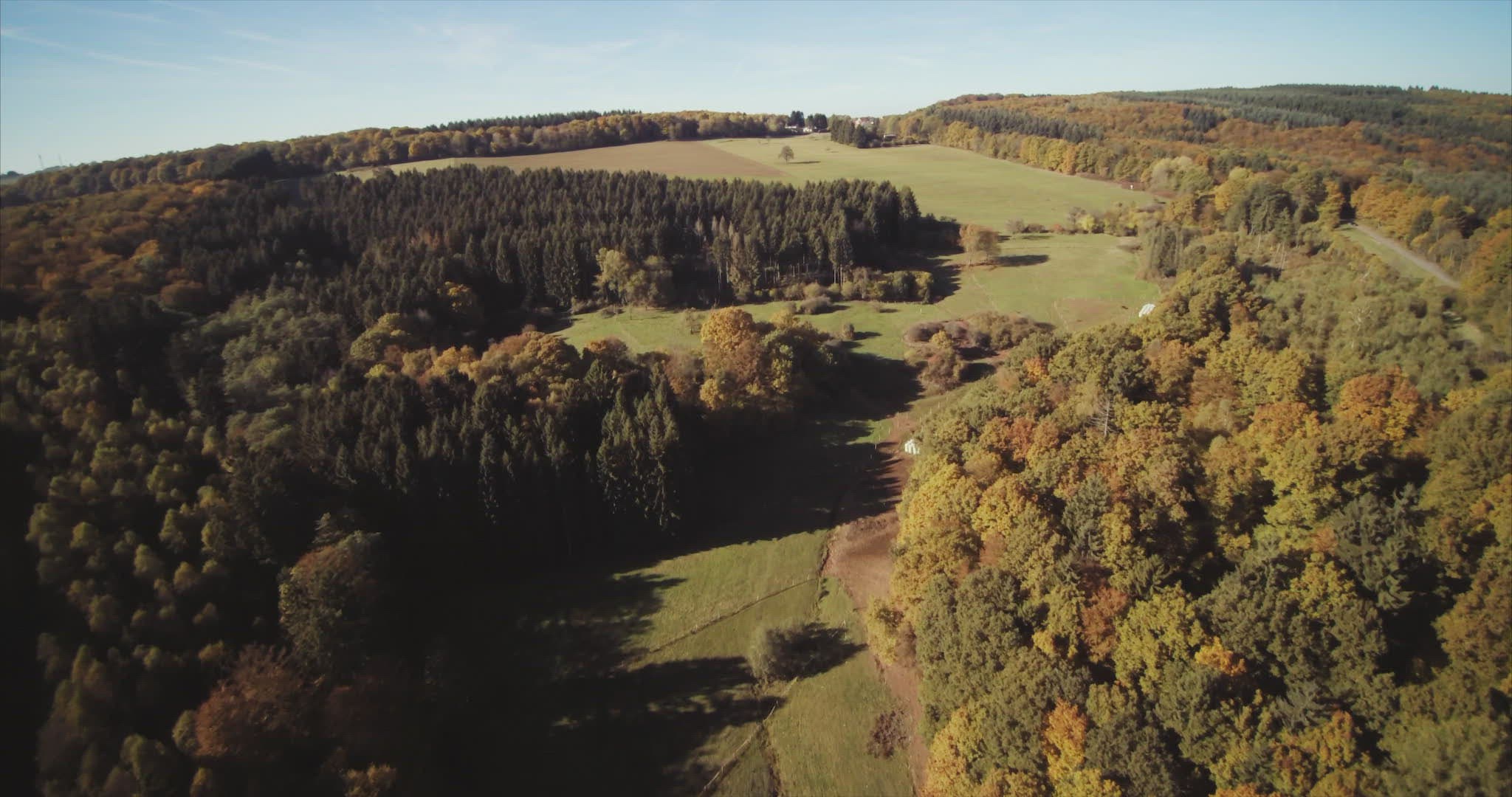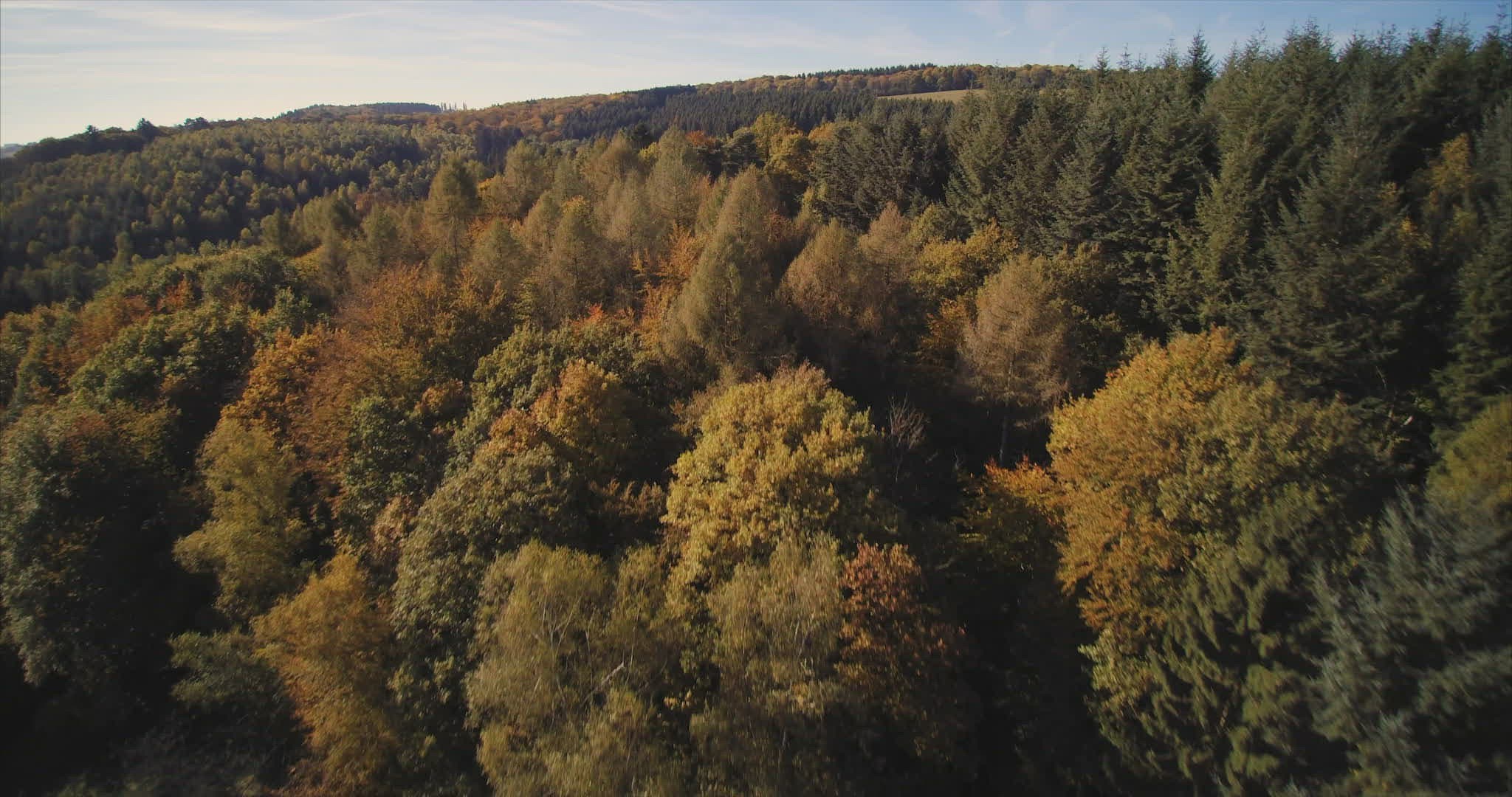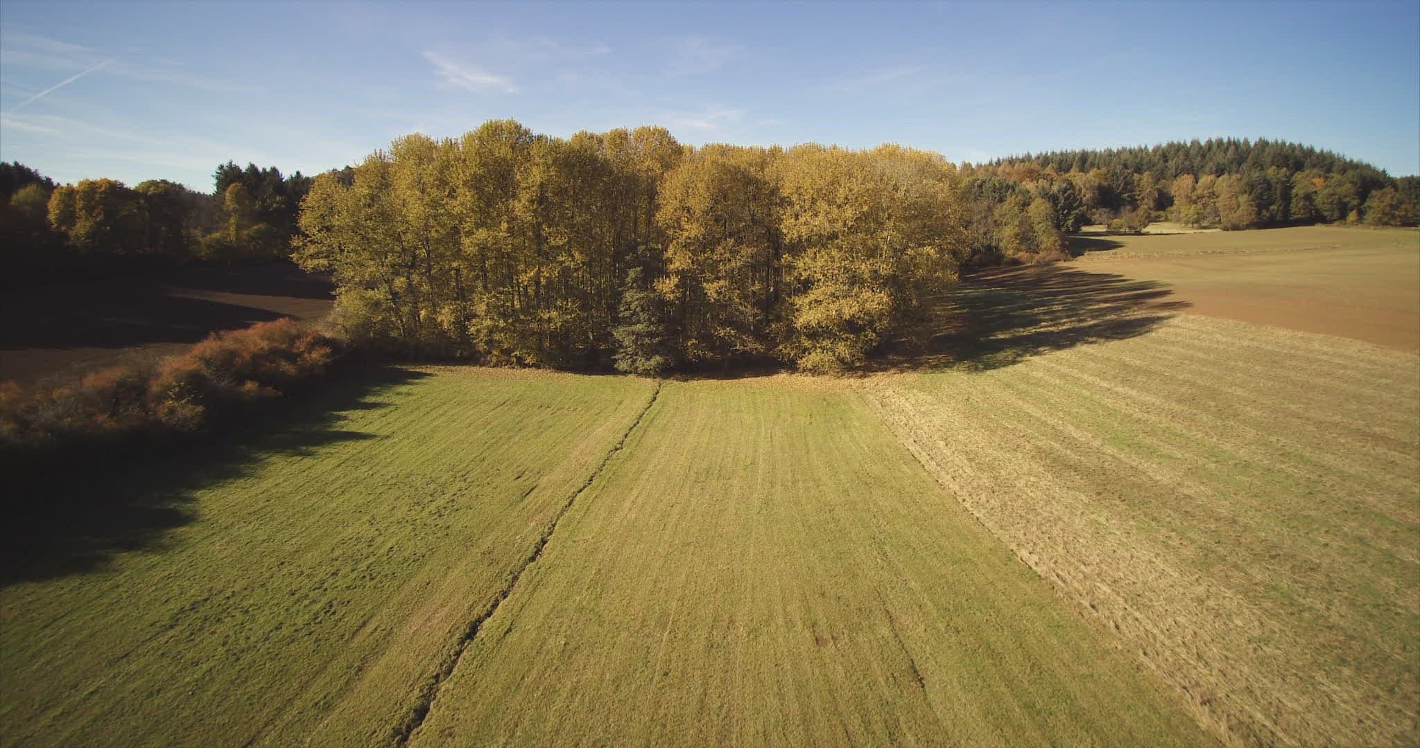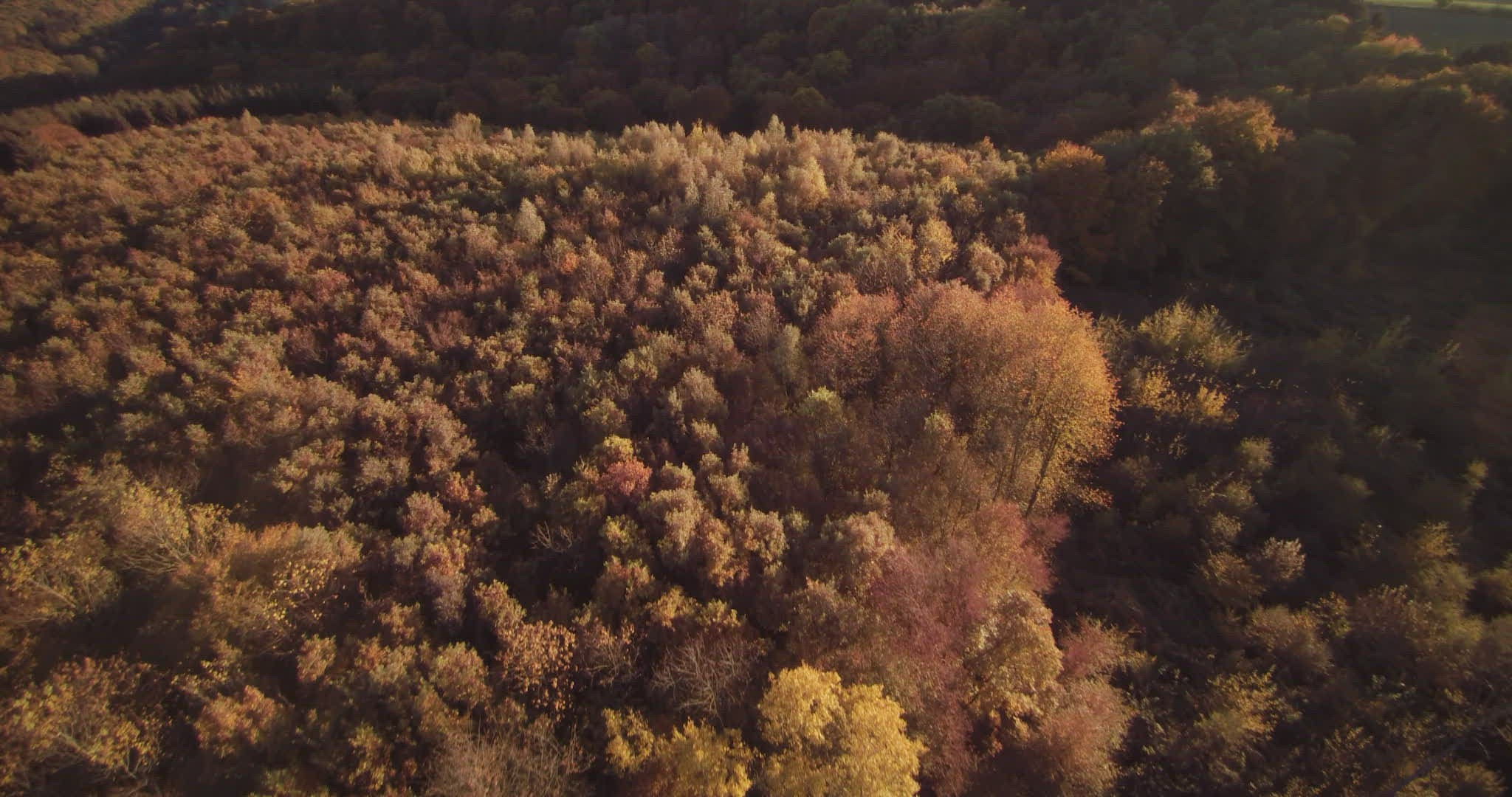 Aerial shot. Drone flies over ploughed crop fields with fall trees in evening sun and wind turbines on the horizon. Germany, Saarland.