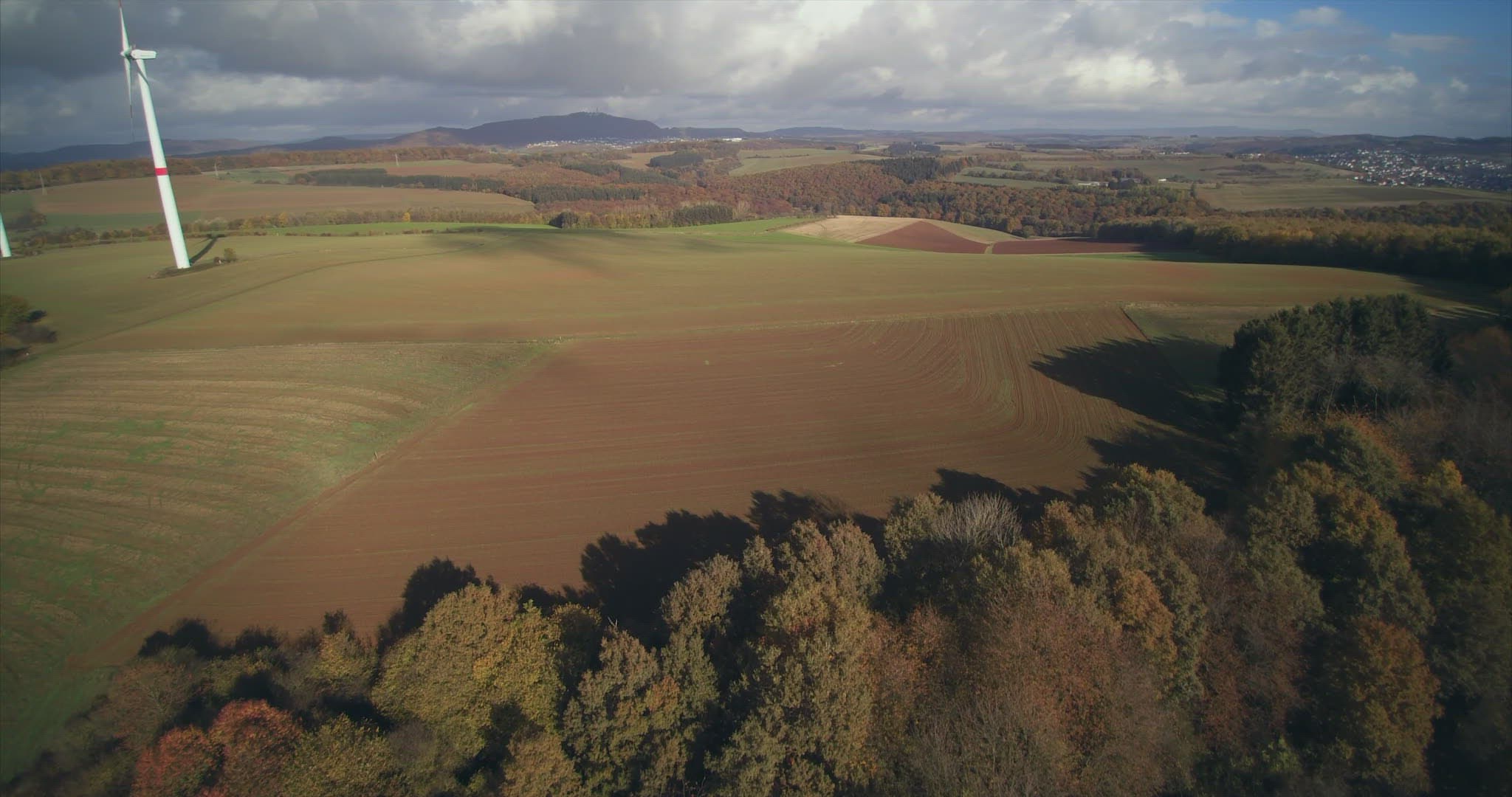 Aerial shot. Drone flies over forest fall trees in evening sun and grassland, plouged meadows with spinning wind turbines against grey clouds. Germany, Saarland.