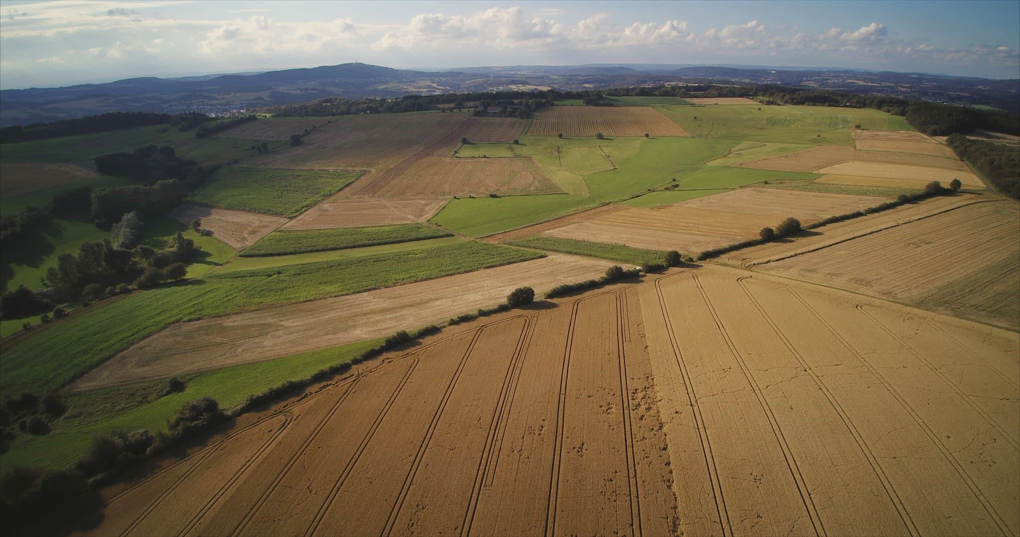 aerial drone shot over vast crop field with tractor lines and green meadows in uprising tree landscape