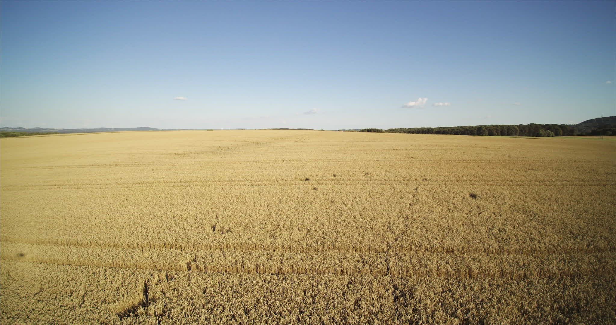 Aerial shot. Drone flies down across wheat field with tractor lines to blue sky horizon and trees. Germany, Saarland