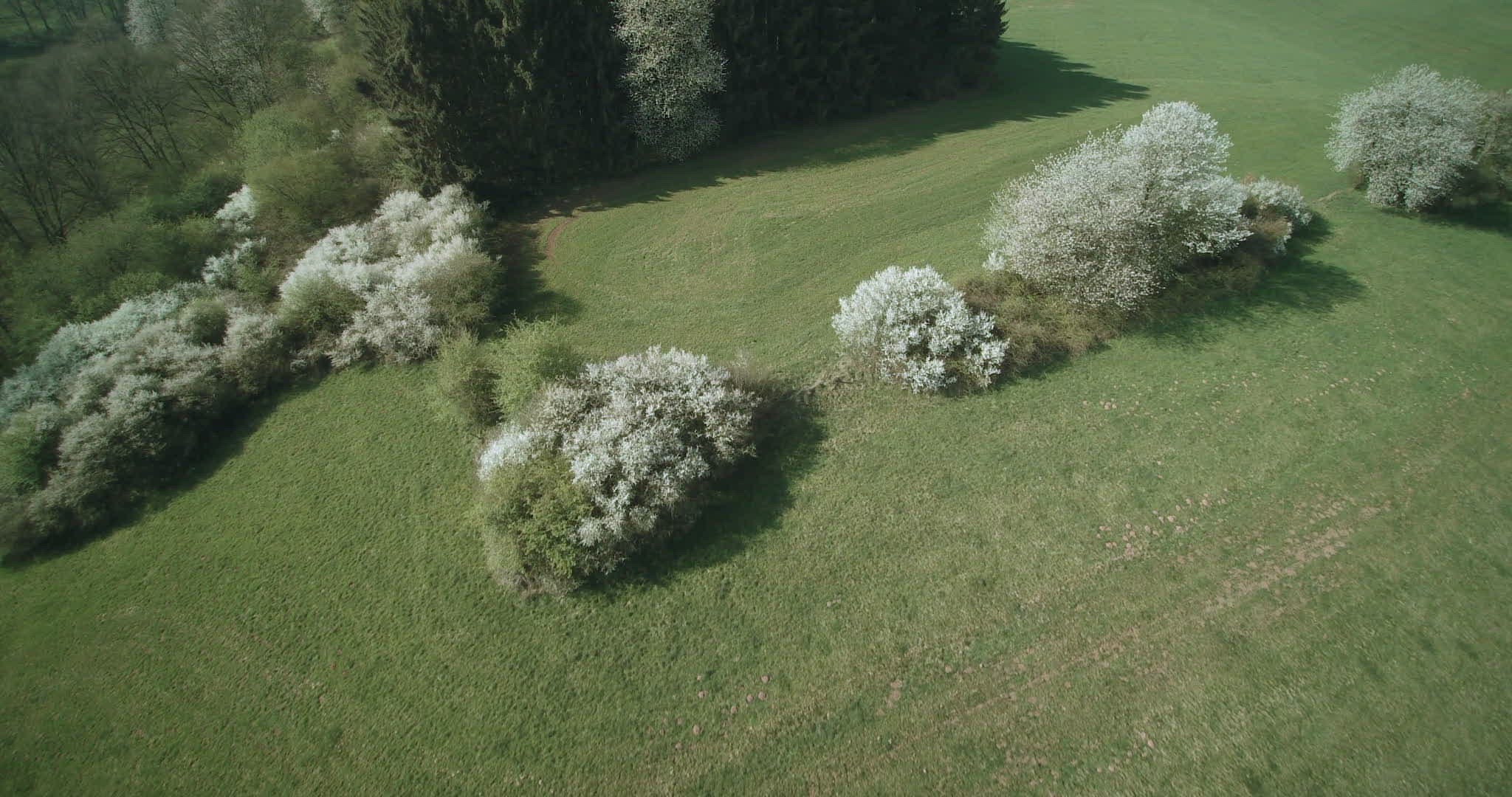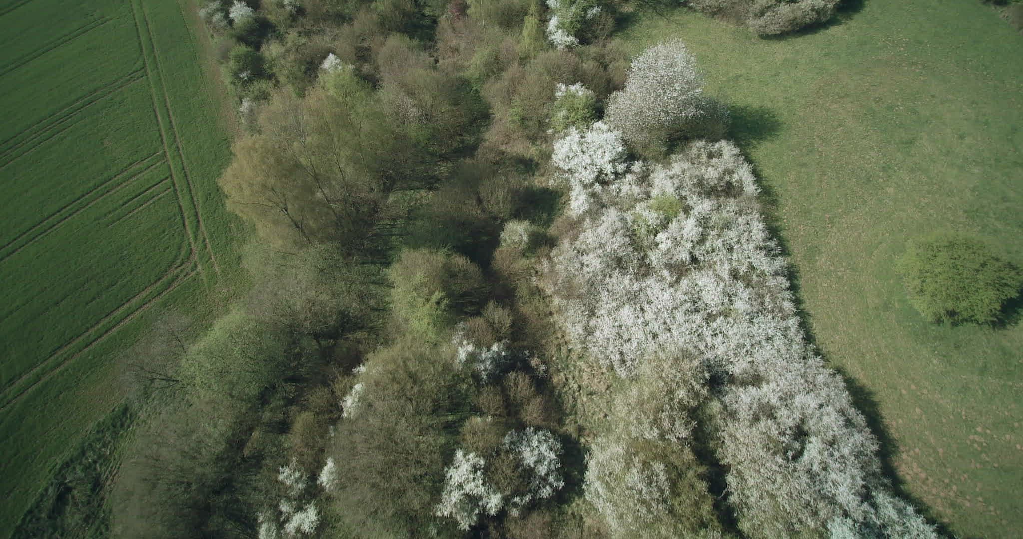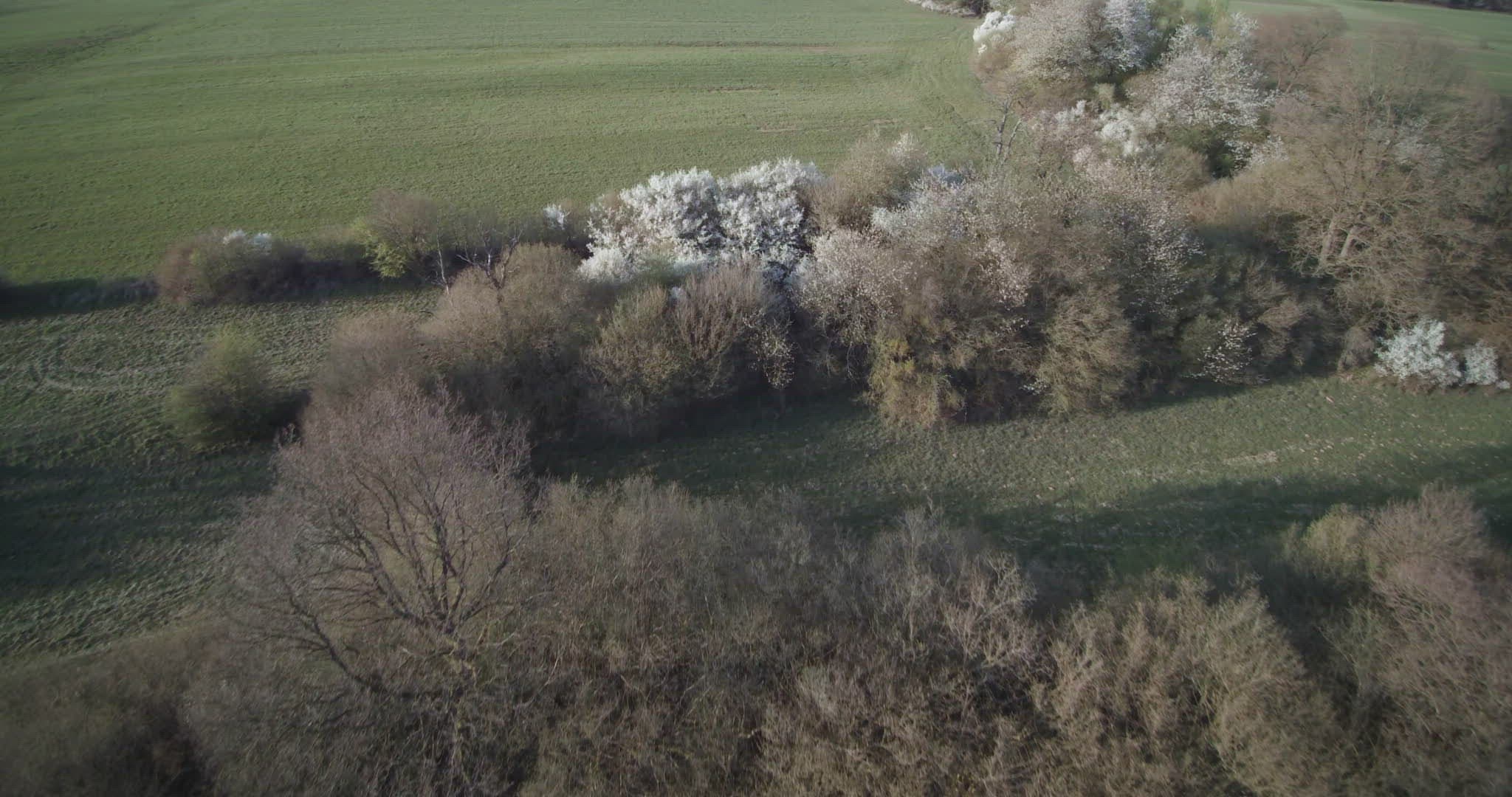 Aerial shot. Drone flies up cherry tree in full bloom in green crop fields and rolling landscape. Saarland, Germany.