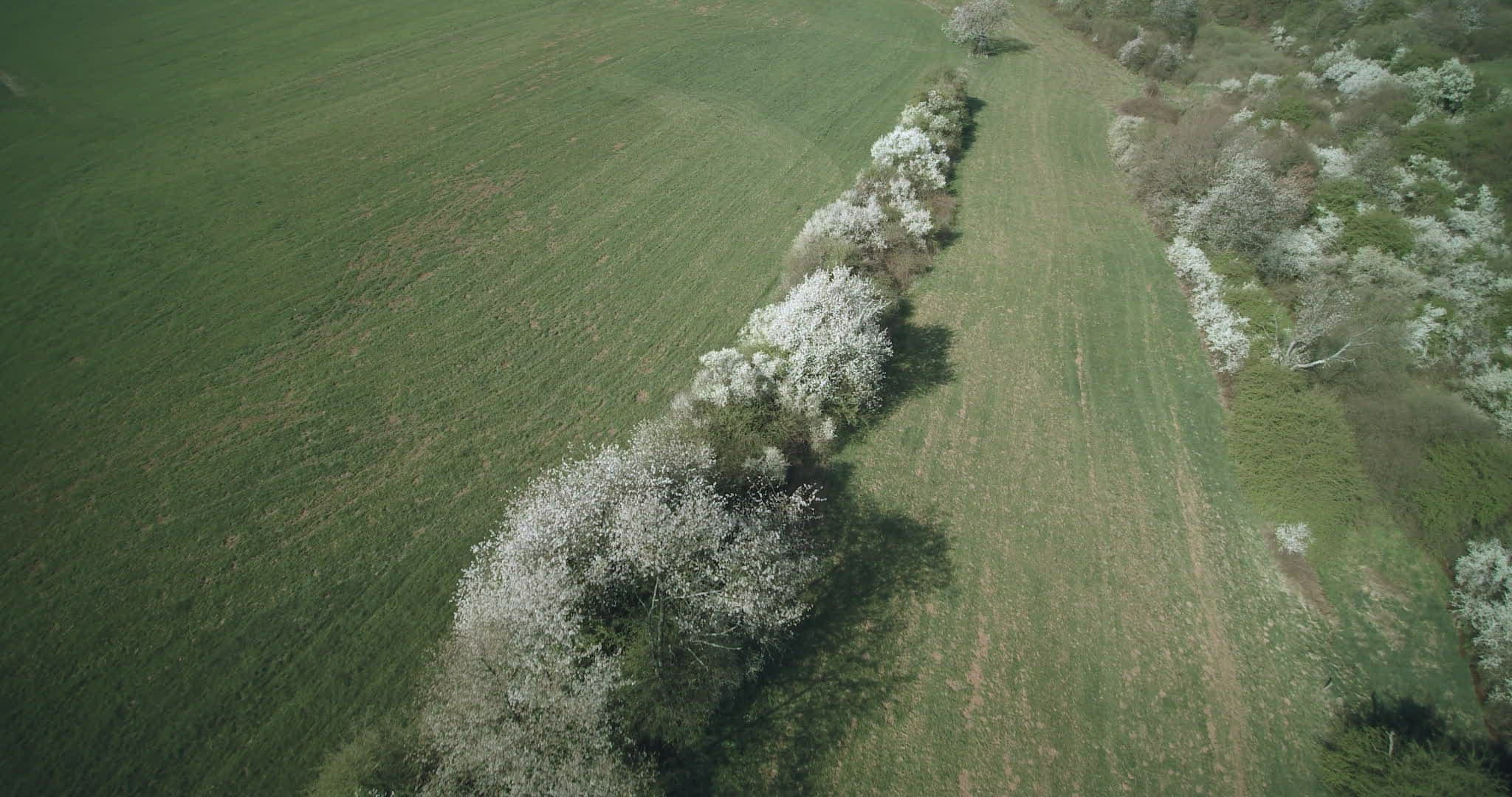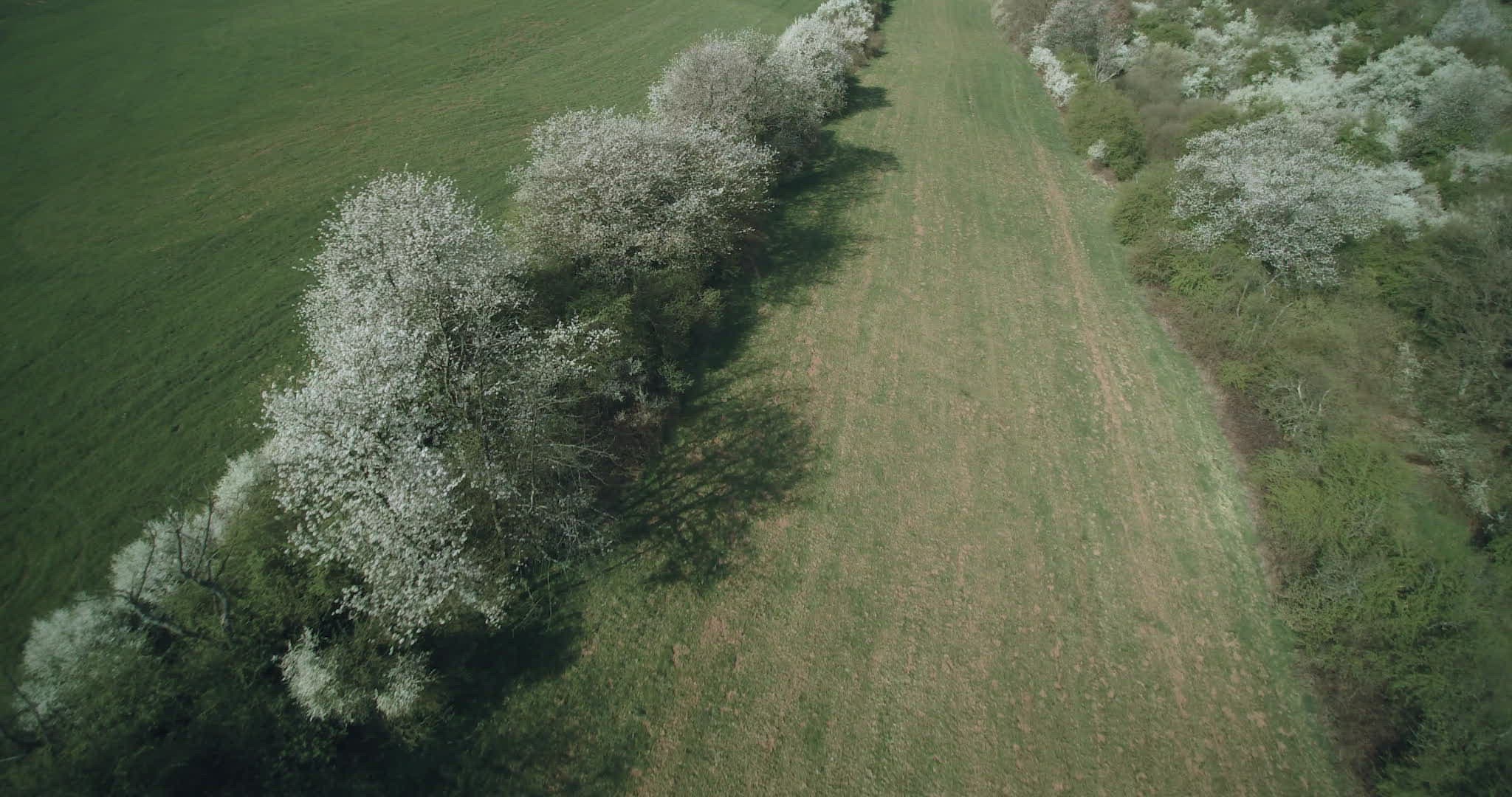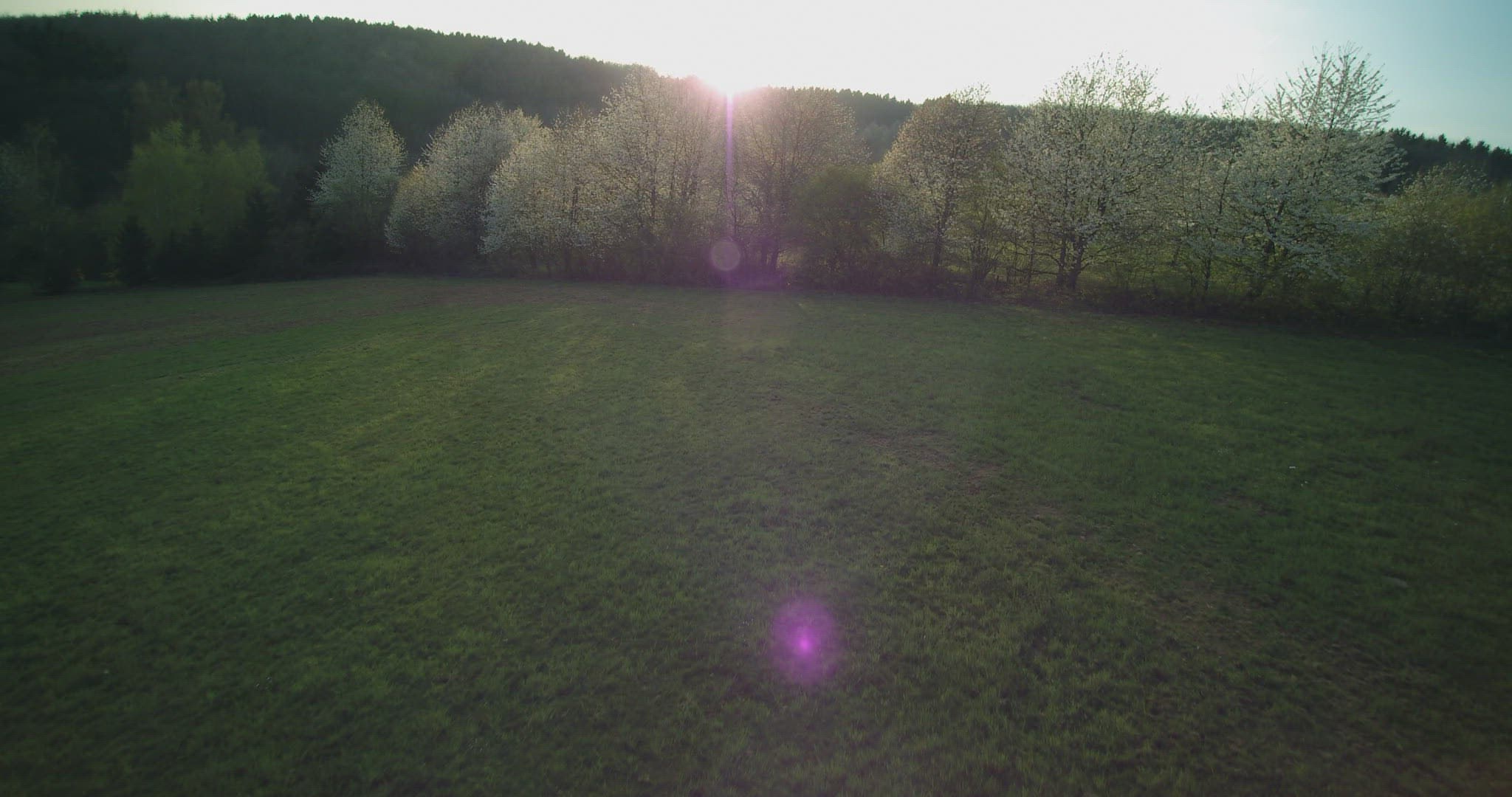 Aerial shot. Drone flies up cherry tree in full bloom in green crop fields and rolling landscape. Saarland, Germany.