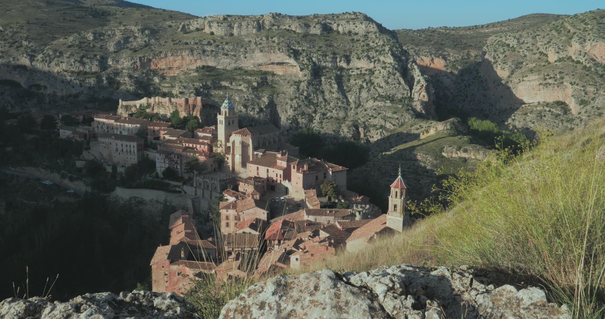 Tilt up rocky hills to valley, Albarracín Cathedral with bell tower and houses in Old Town of Albarracín, Province of Teruel, Aragon, Spain