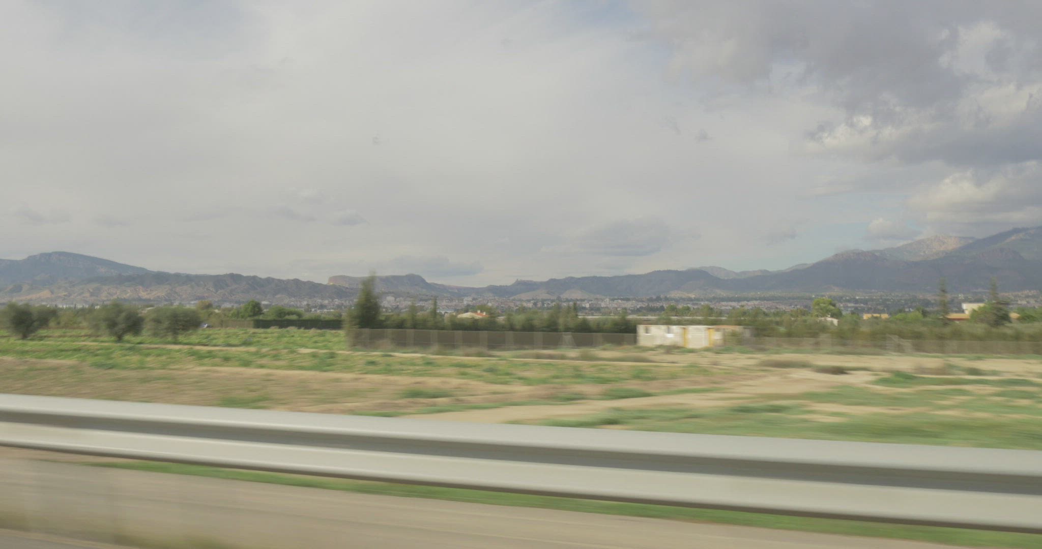 drive pov sideways, highway and agricultural fields of Murcia against mountain backdrop