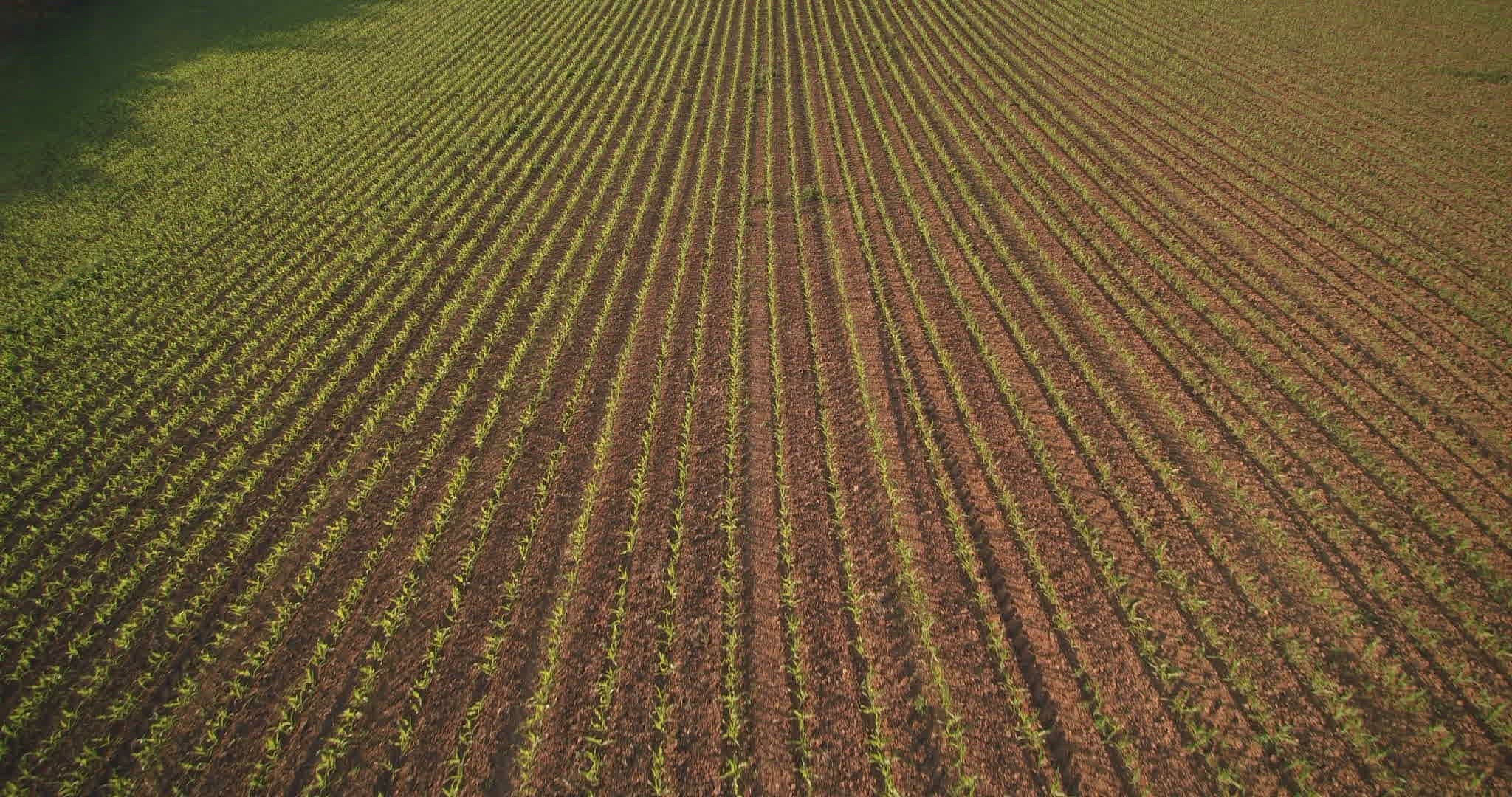 Aerial shot. Drone flies over lines of fresh sunlit green sprouting maize field and brown earth. Saarland, Germany
