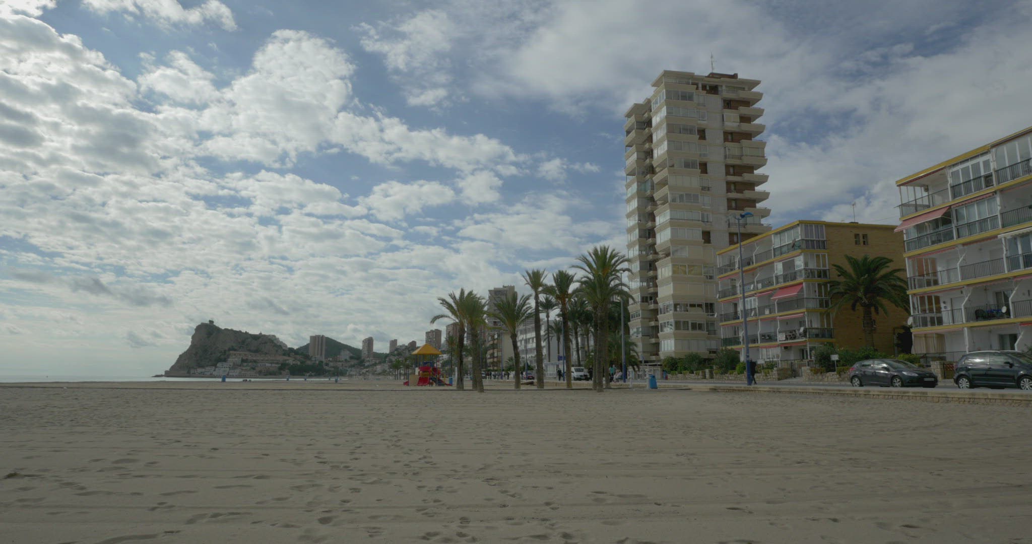 pan shot, beach front in Benidorm with high-rise hotel buildings and palm trees