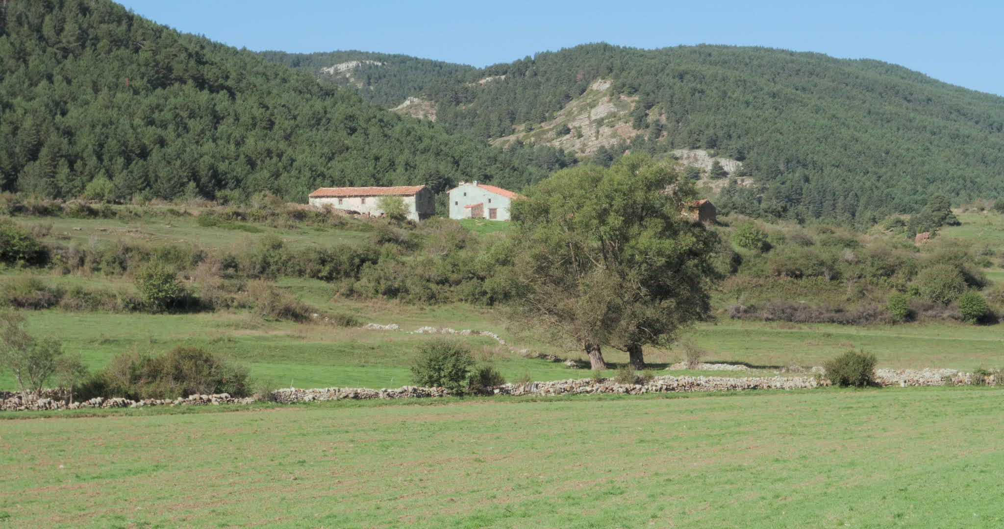 Pan shot isolated farm house in forested mountain region of Sierra de Gúdar, Province of Teruel, Aragón, Spain