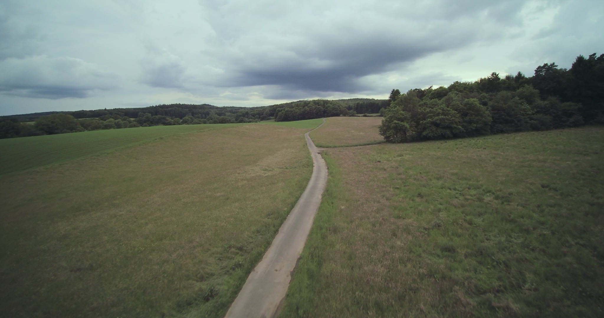 Aerial shot. Drone low flight, narrow winding country road between pink feathery grass meadows and uprising forested landscape against grey clouds. Saarland, Germany.