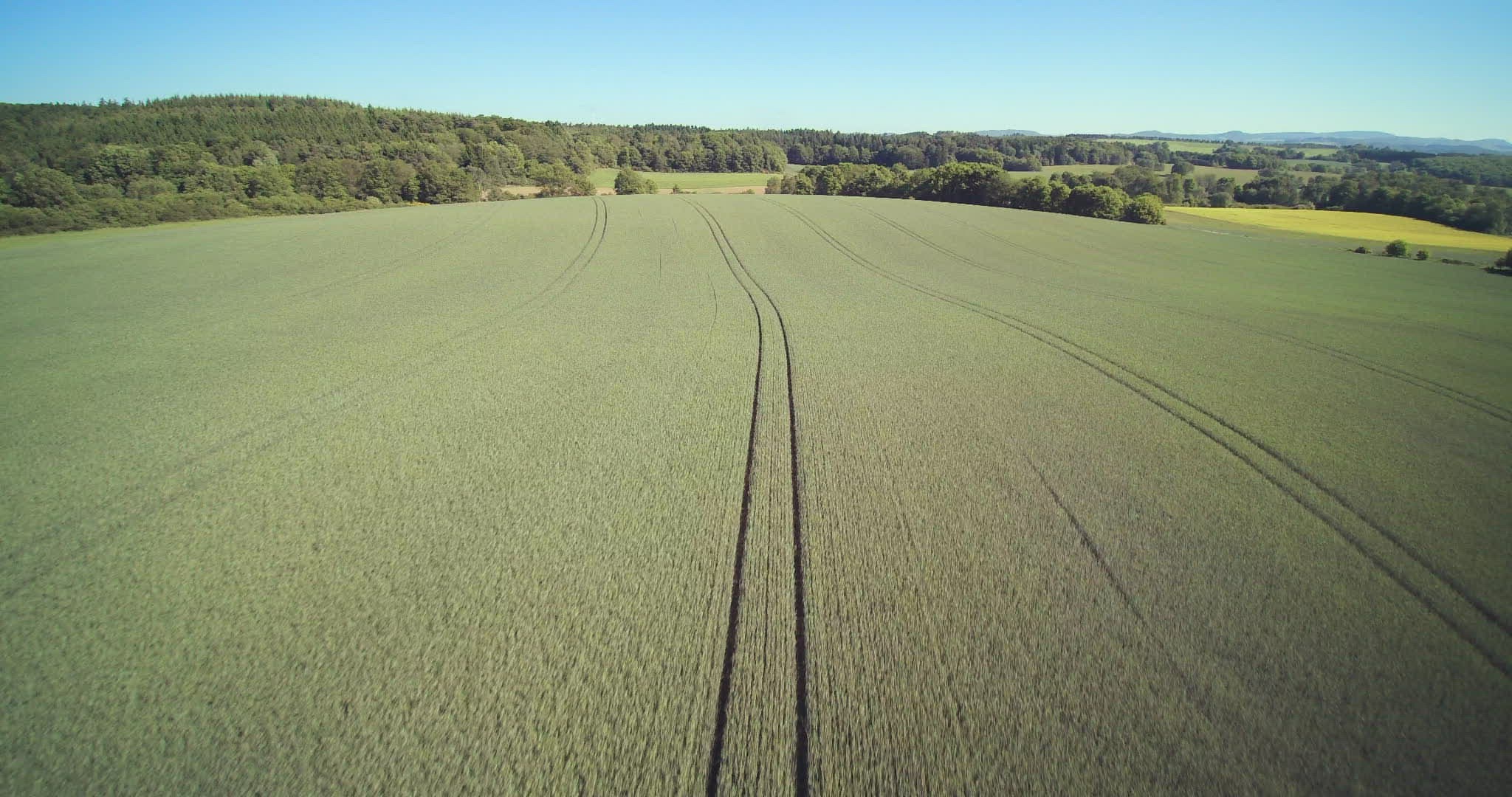 Aerial shot. Drone low shot rises over tractor lined crop fields with yellow canola and forested rolling landscape. Saarland, Germany.