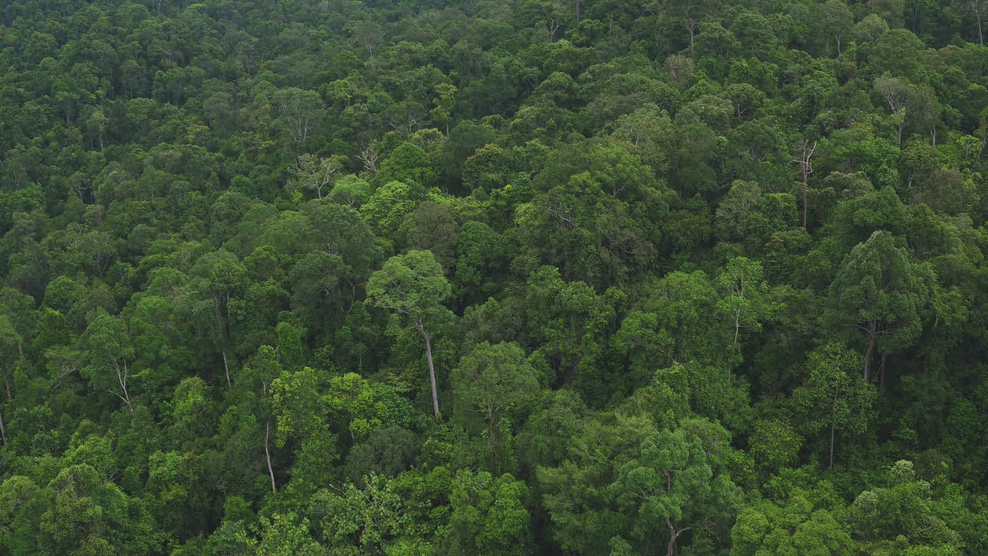 POV aerial shot over vast forest fall tree crowns in rolling countryside with highway, Saarland, Germany