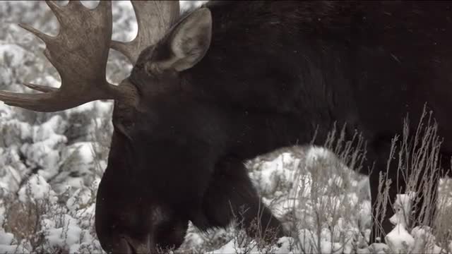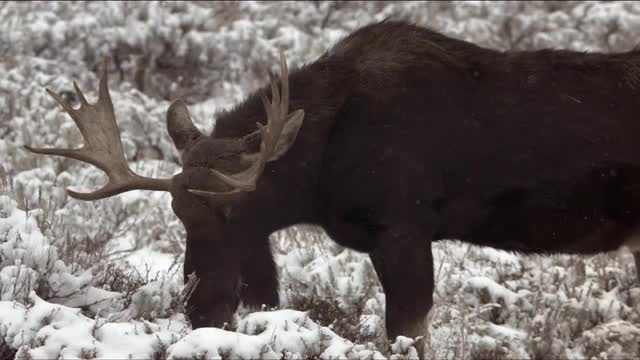 Moose eating snowy grass in slow motion