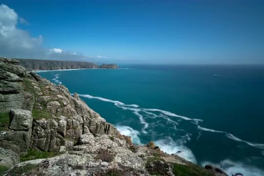 1061834 - 8K Rocky Coastline Waves Crashing Foam Line Timelapse Porthcurno , Cornwall, England, United Kingdom