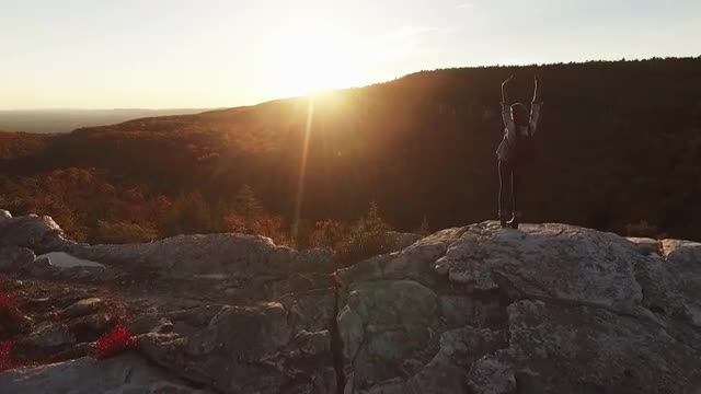 397933 - Amazing Aerial of female hiker running to the top and putting hands in the air