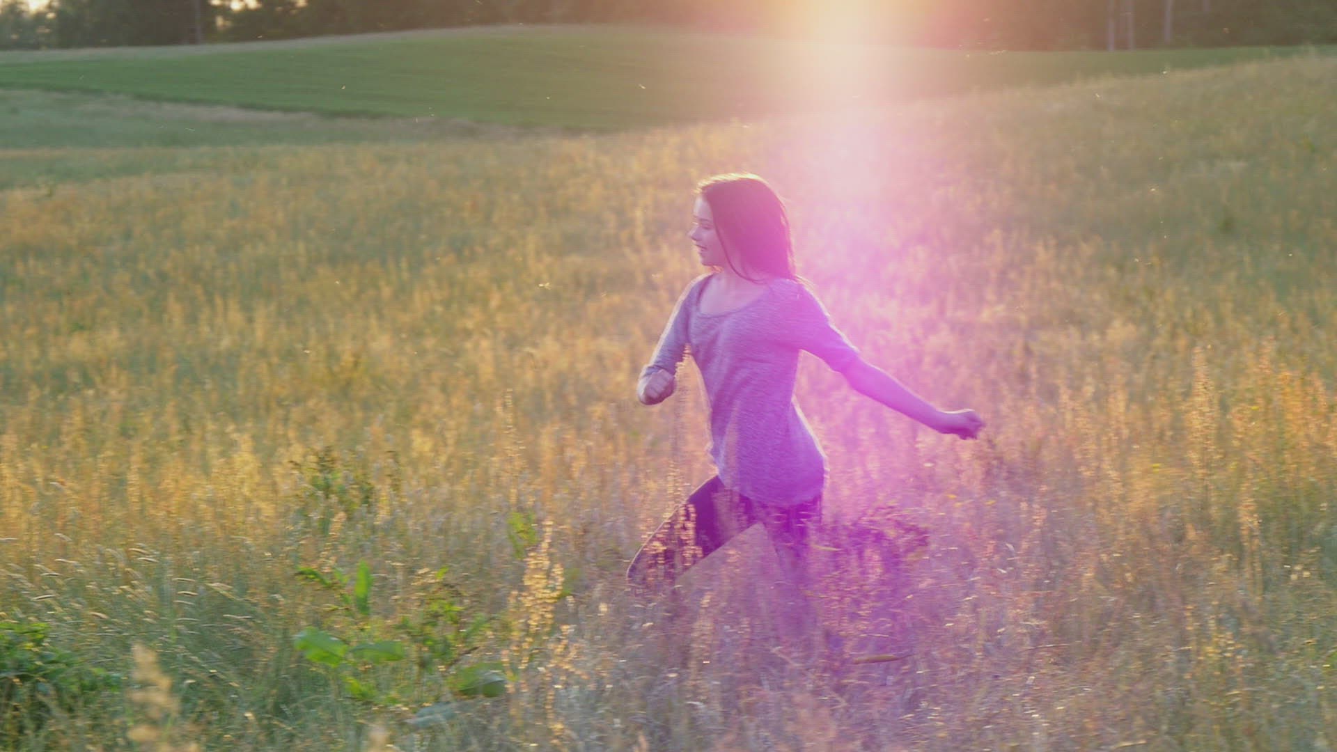 Teenage girl runs, spins and dances in the wheat field at sunset