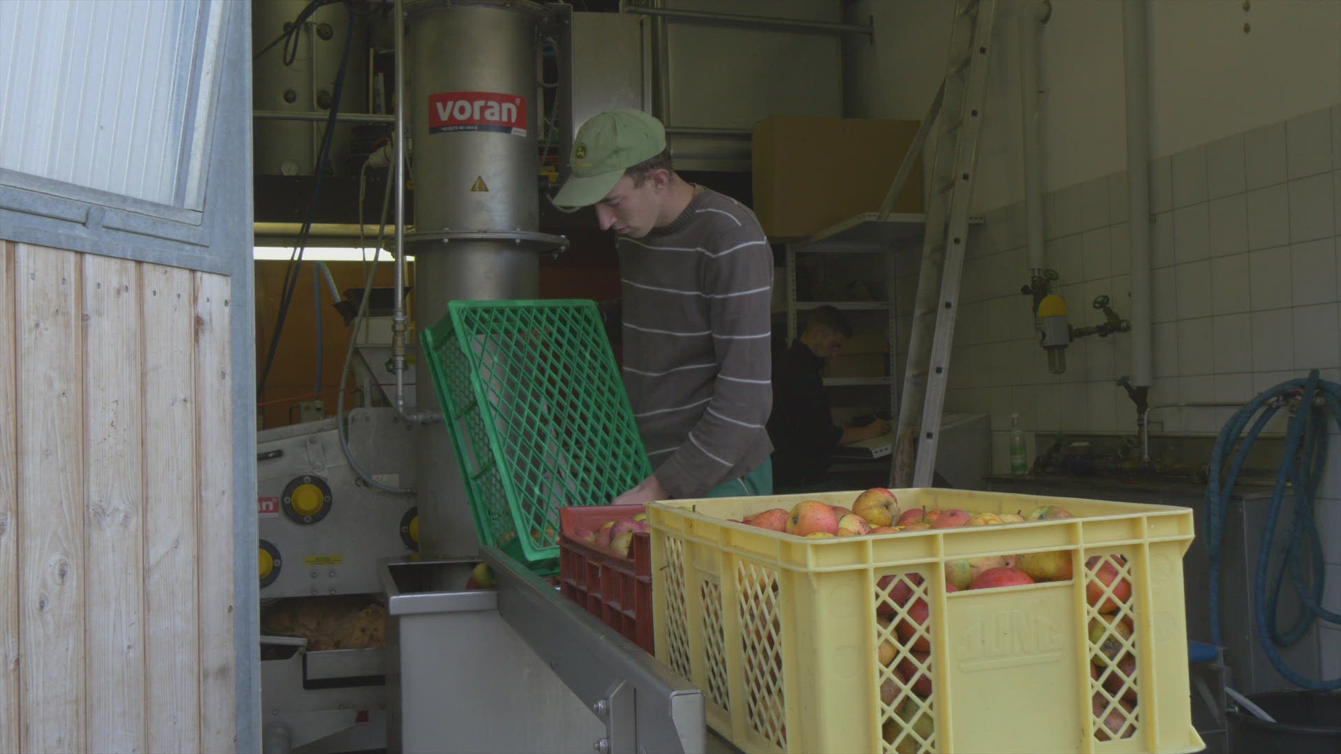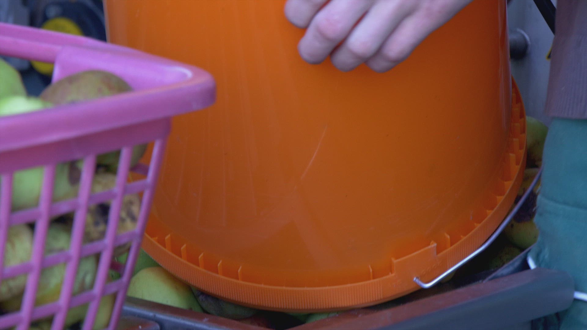 apple juice production - women fills apples into water basin