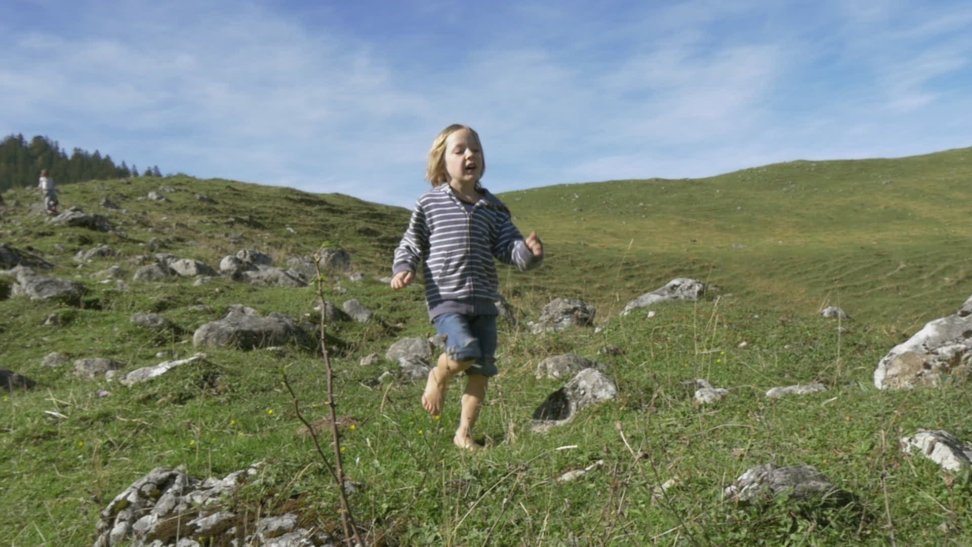 boy jumps barefoot in the alps