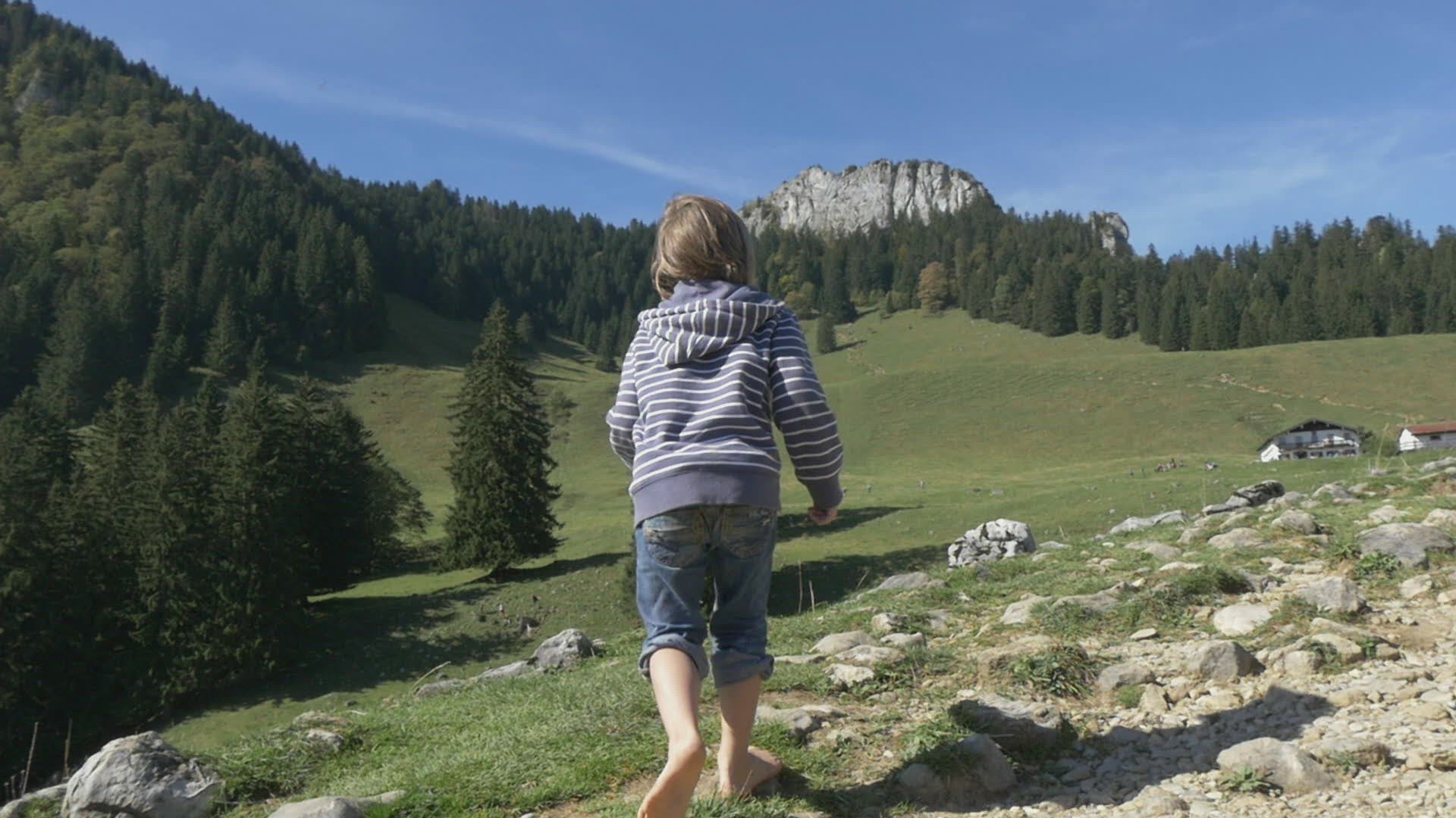 boy hikes barefoot in the alps