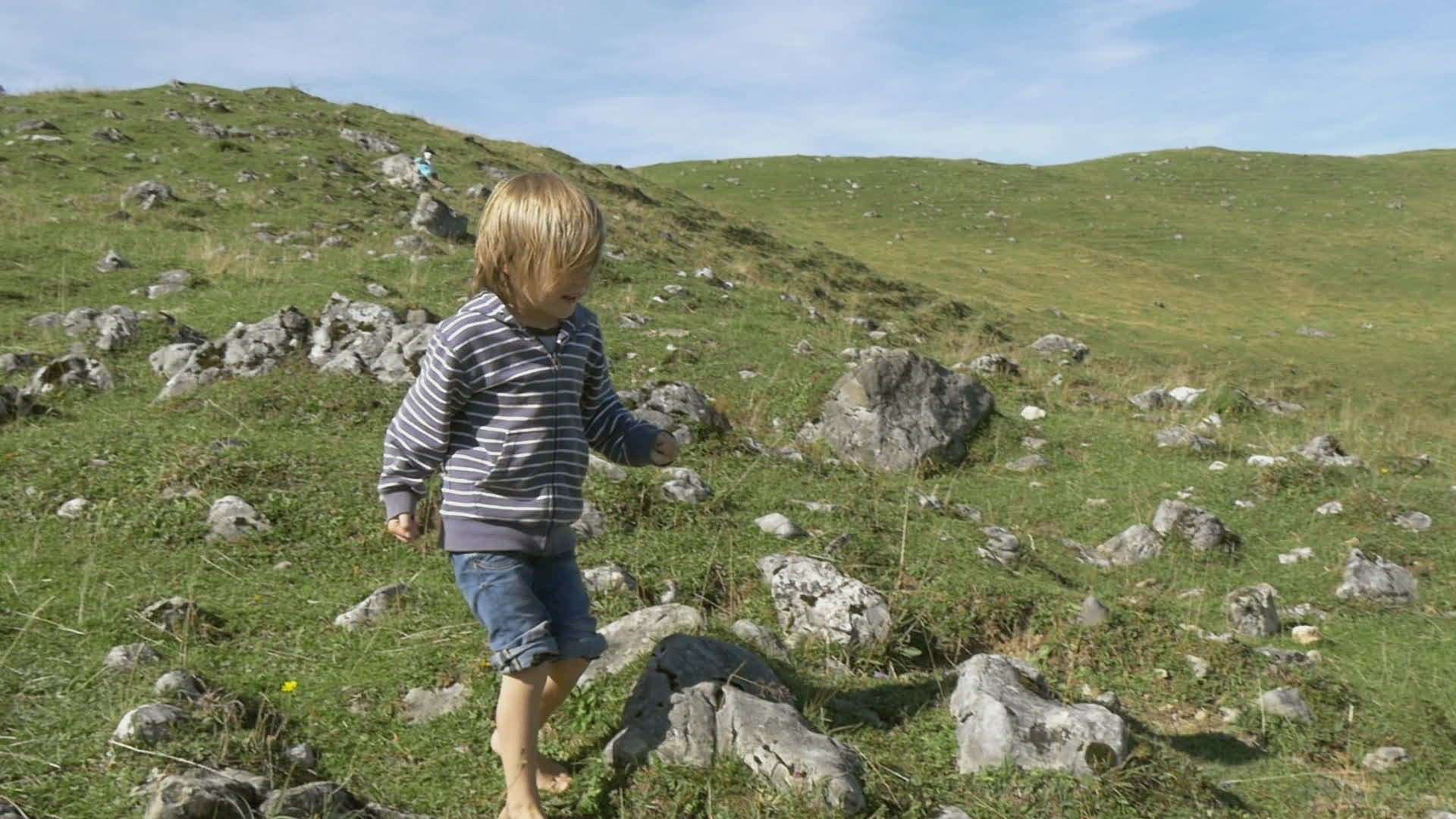boy hikes barefoot in the alps