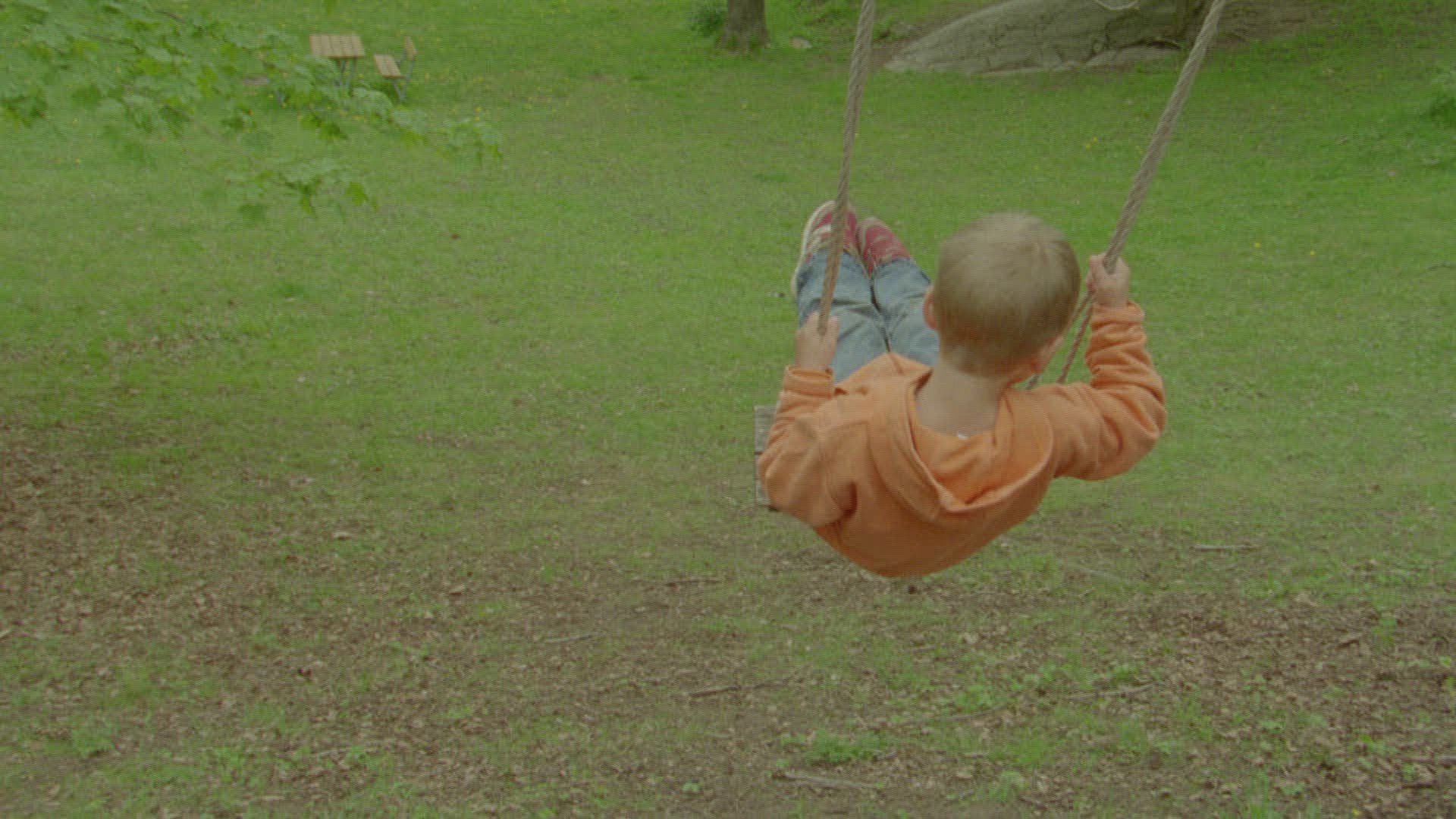 young boy swings on tree