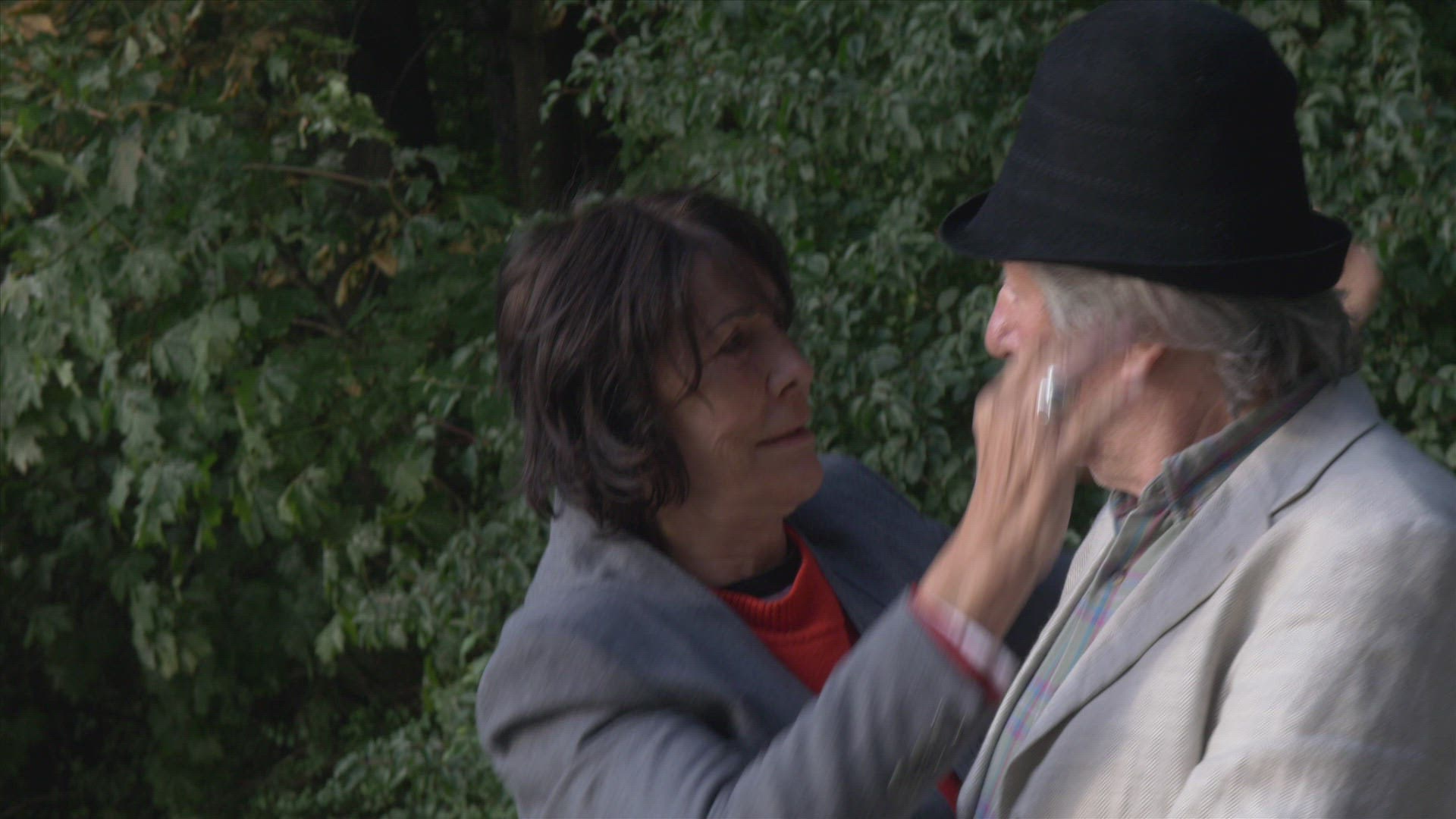 elderly couple kiss in beergarden at a lake