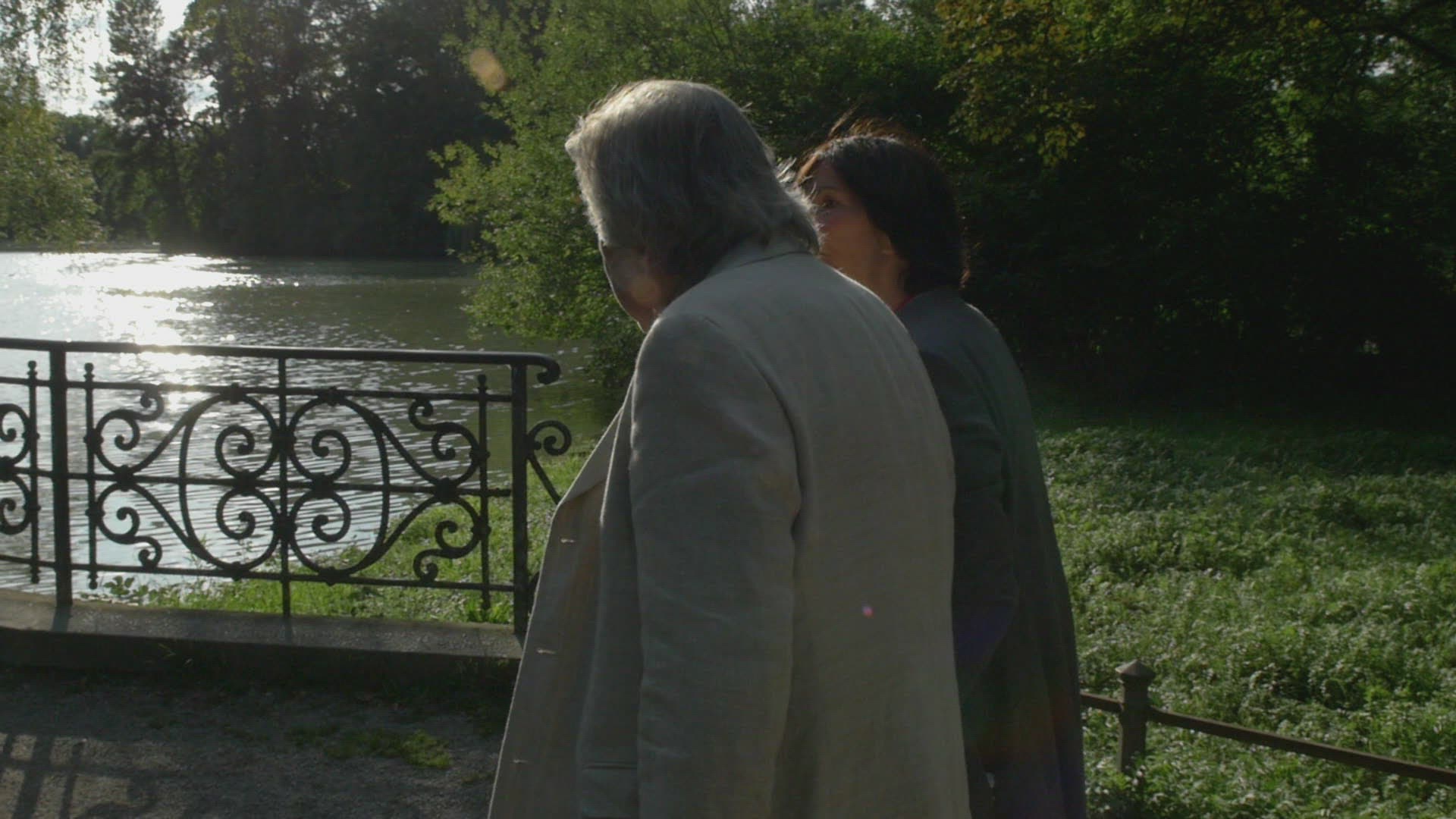 elderly couple in love take a walk at the lake