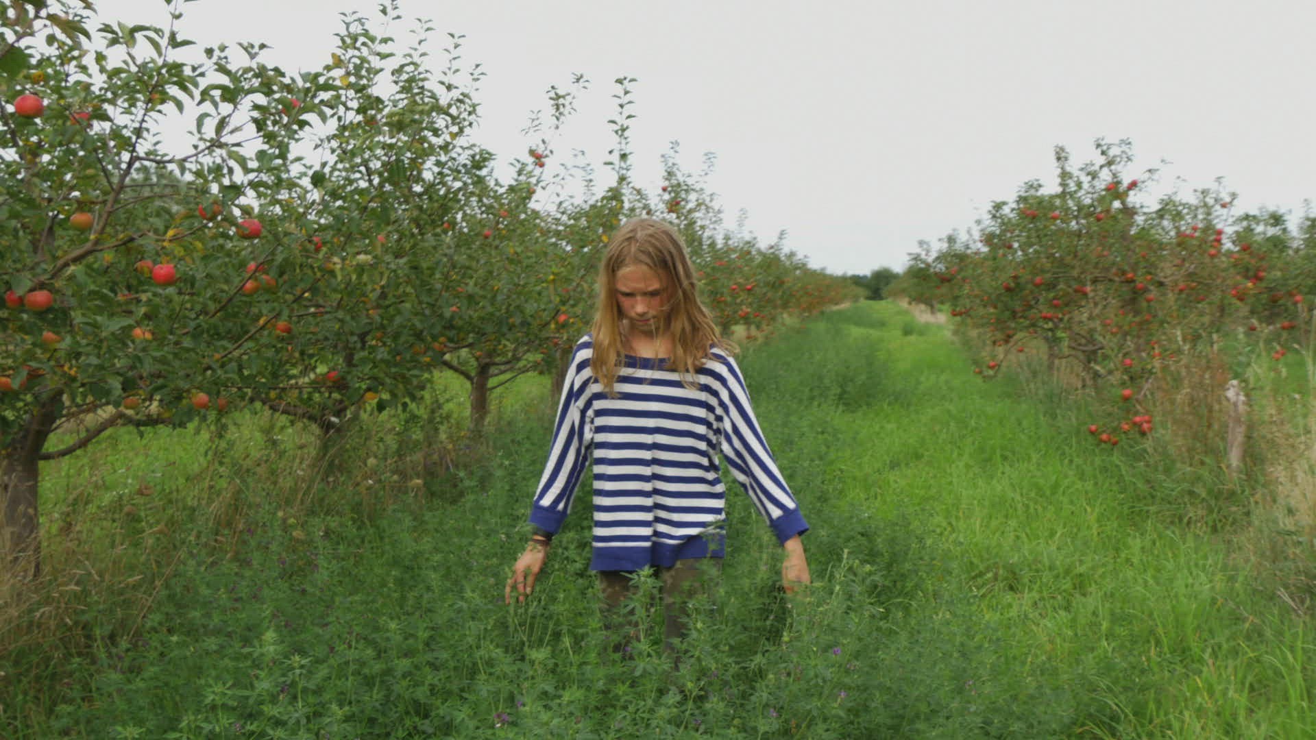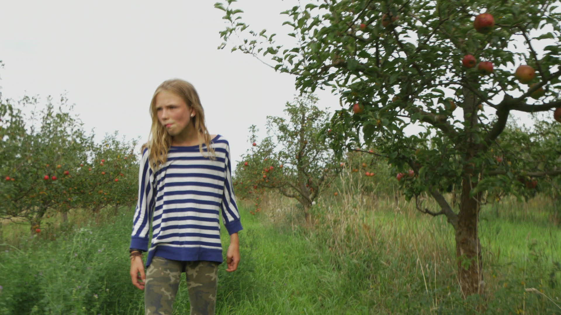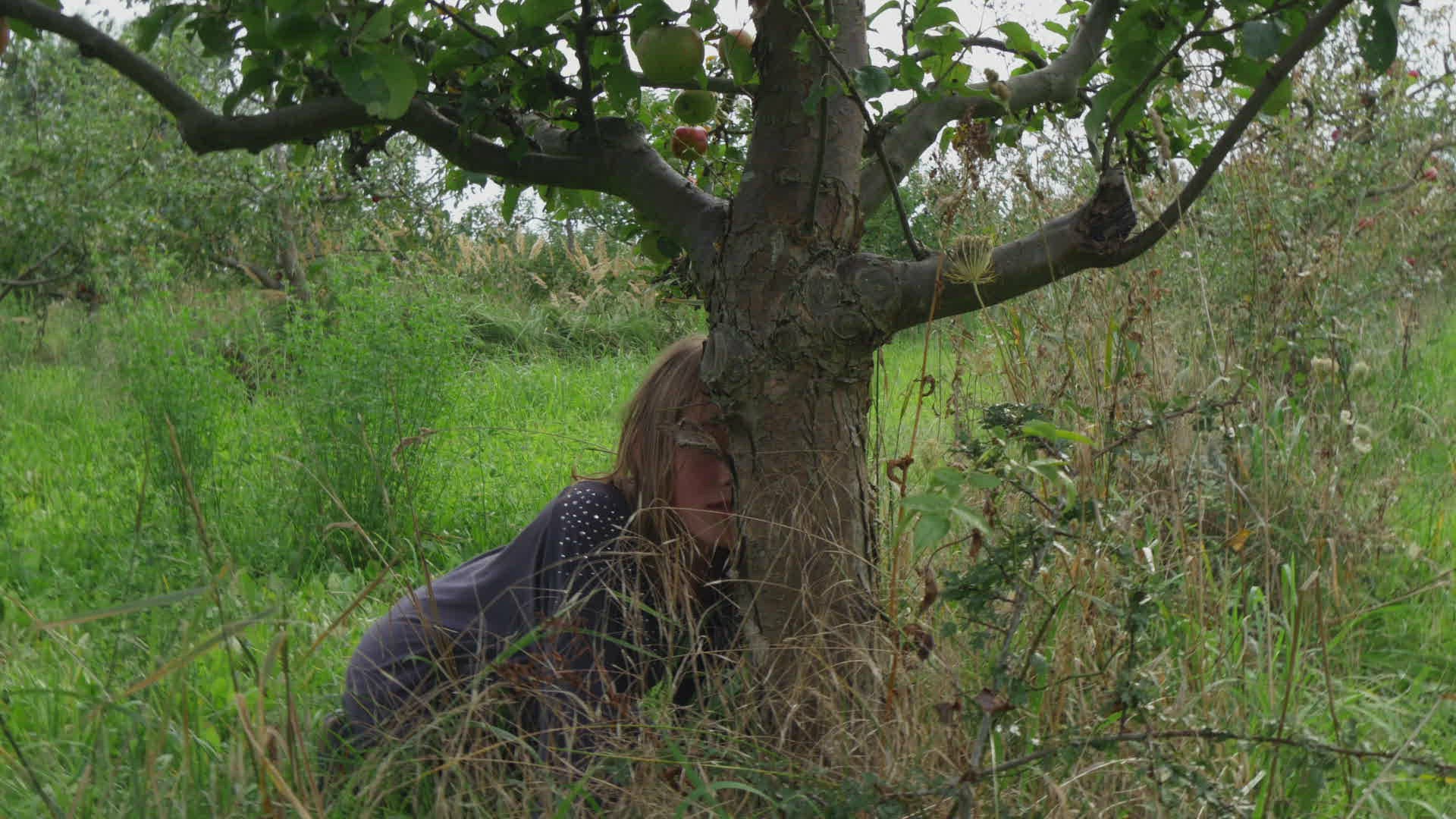 girls play hide and seek in apple orchard