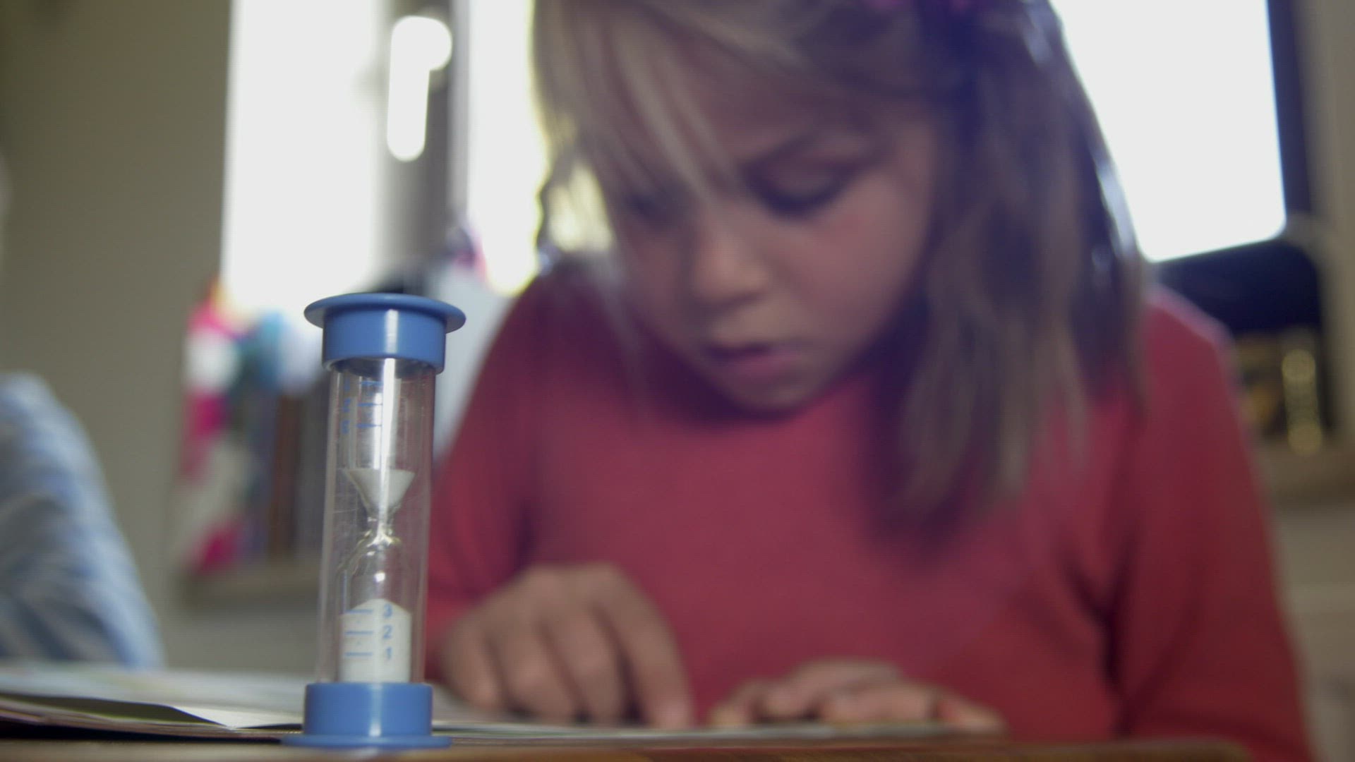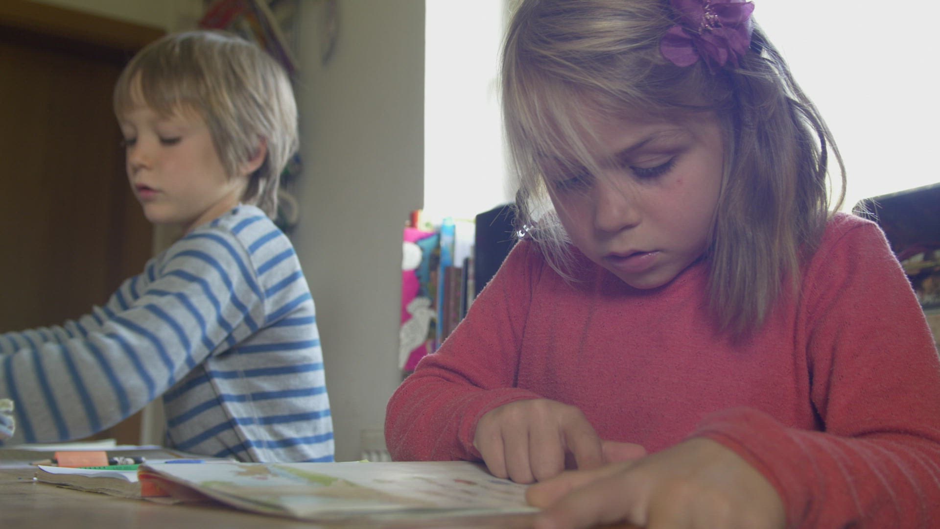 girl makes homework and learns to read