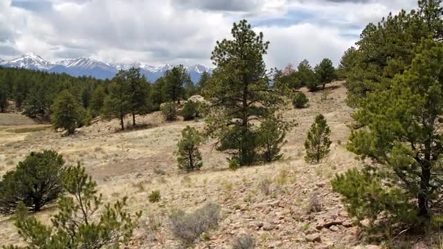 Time-lapse with upward movement revealing snow capped Sange de Cristo Mountain range.