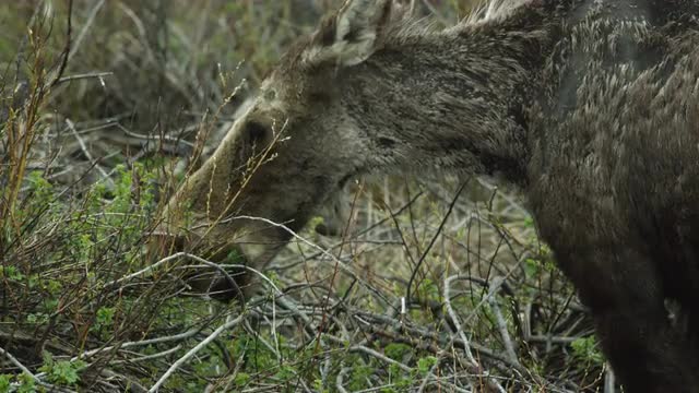 Wide shot of a moose eating plants.