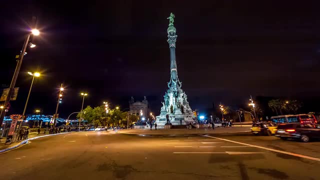 4K UHD timelapse footage (320 frames) of traffic at the Columbus Monument, a 60 m (197 ft) tall monument to Christopher Columbus at the lower end of La Rambla, Barcelona, Catalonia, Spain.