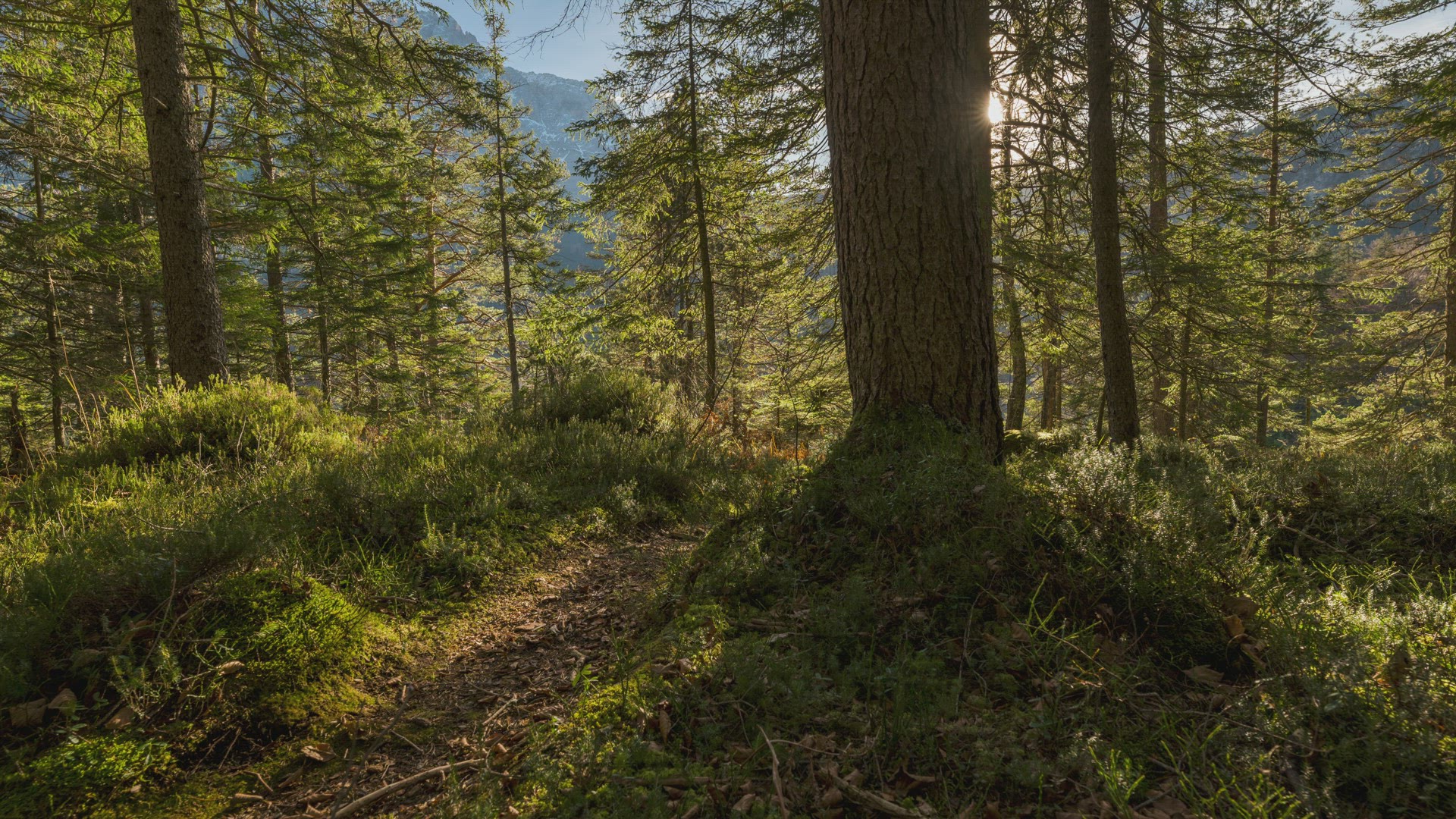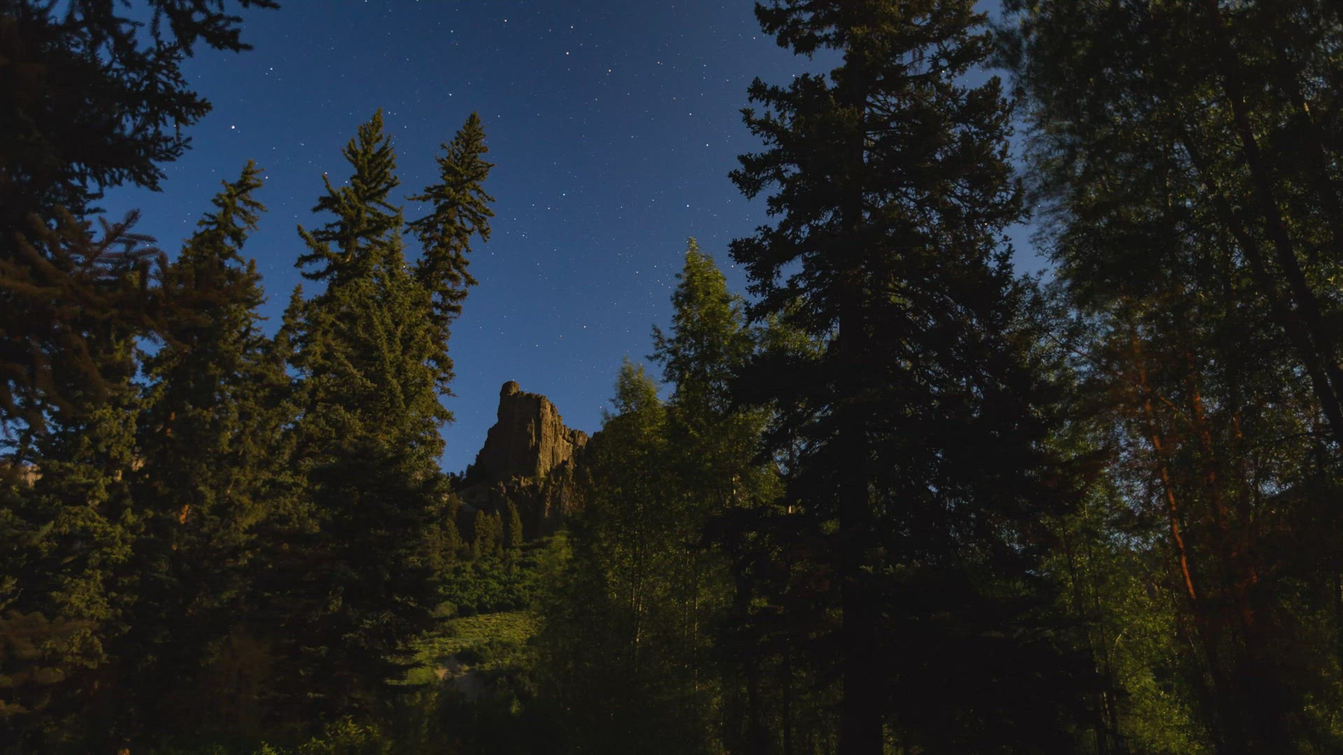 Timelapse of a starry night. Camera looks up at the tops of trees in a forest. Timelapse goes until the sun rises.